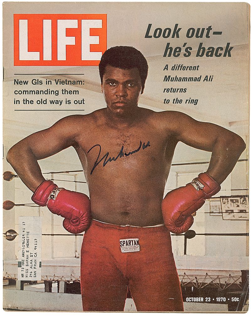 Life magazine, dated October 23, 1970, featuring an imposing image of Ali on the cover, signed on the front cover in black felt tip. Scattered light creases and wrinkles to cover, light toning inside, and a mailing label to front cover, otherwise fine condition.