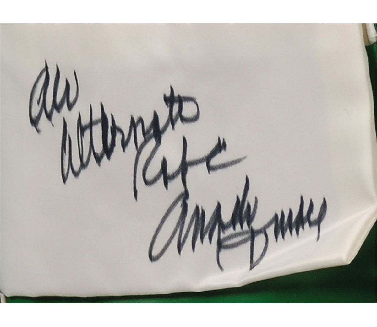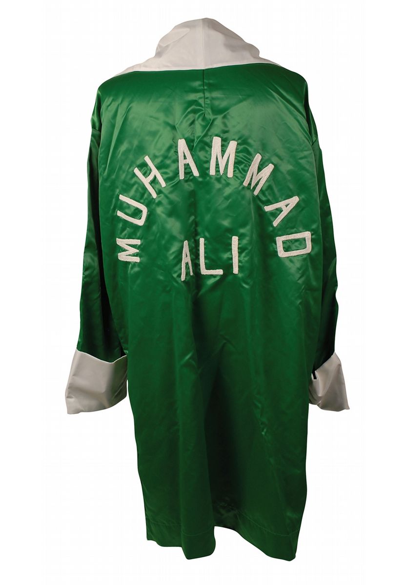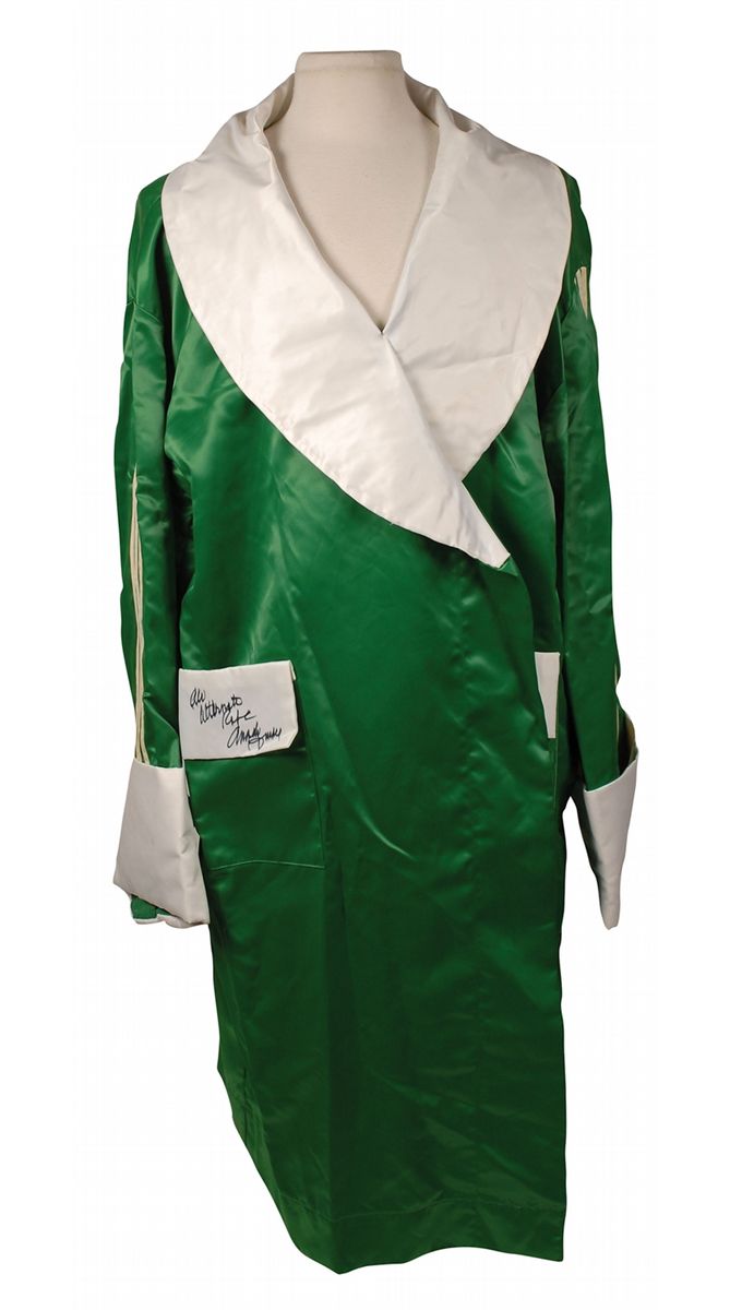 Green satin boxing robe, with white trim and Ali’s name sewn on the back in large white letters, signed in black felt tip on a white pocket flap, “Ali alternate robe, Angelo Dundee.” Accompanied by a letter of authenticity from Dundee which reads, “Date: June 30, 1975. Ali vs. Joe Bugner. Kuala Lumpur, Malaysia. One green boxing robe worn by Muhammad Ali when training for the Joe Bugner fight in Malaysia. It is green with white trim and signed by me. It is an alternate robe used by the champ. His name is embroidered on the back. Angelo.” In fine condition, with a bit of light feathering to signature due to nature of the material. The Ali-Bugner fight was held on Tuesday morning, July 1, 1975, which was Monday evening, June 30, 1975 in the United States. Ali easily won a 15-round decision. After the fight he backtracked on an earlier retirement statement and said he would remain in Malaysia and train there for his October 1, 1975, fight with Joe Frazier, remembered as the ‘Thrilla in Manila.’ It is not a stretch to say that this green satin robe was most probably worn by Ali in Malaysia after the Bugner fight while training for his last fight with Joe Frazier, as well as in Malaysia before the fight, as attested to by Dundee.