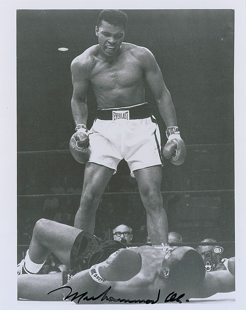 Classic glossy 8 x 10 photo of Ali standing over Sonny Liston, signed in black felt tip. In fine condition, with a few light edge dings and creases.