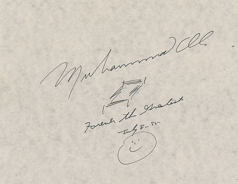 Original signed felt tip sketch of a boxing ring on an off-white 11 x 8.5 sheet of cardboard, signed “Muhammad Ali, Forever the Greatest, July-8-85,” adding a smiley face at the bottom. In very fine condition.