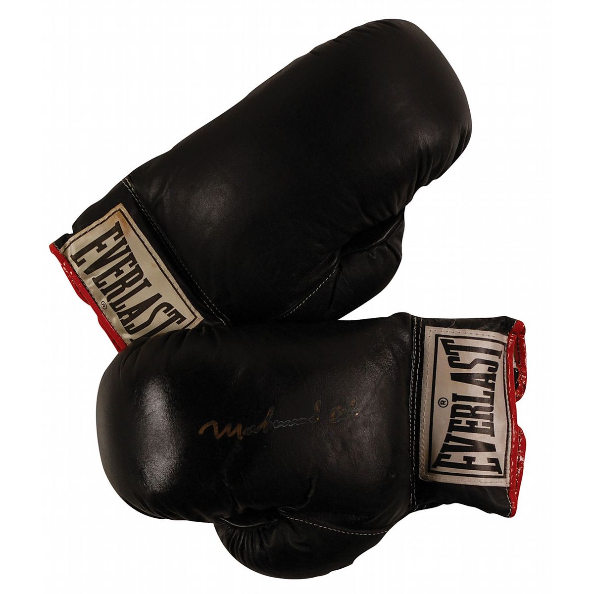 Pair of two Everlast 12-ounce boxing gloves, one signed on the top in gold ink. In very good condition, with areas of the signature faded and discolored.