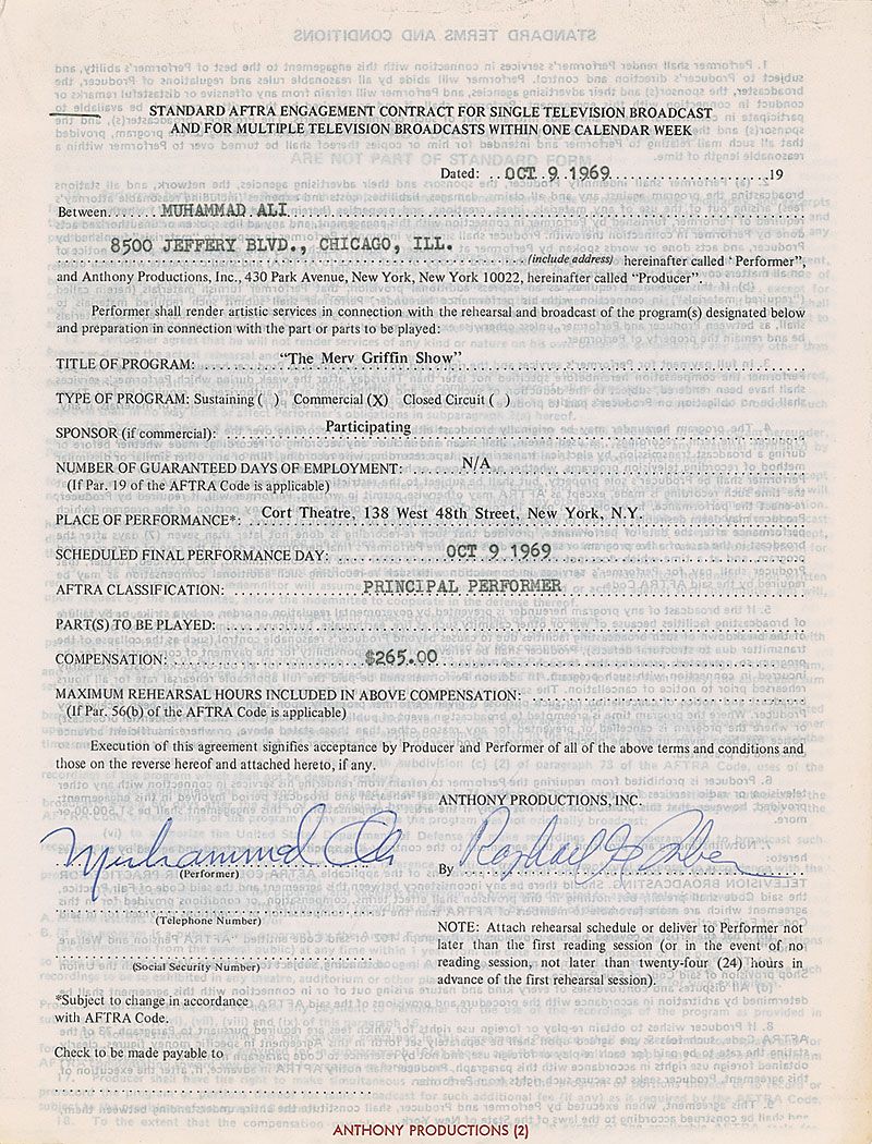 DS, one page, 8.5 x 11, October 9, 1969. Standard AFTRA contract in which Ali agrees to appear on The Merv Griffin Show on the same day in exchange for $265. Signed at the conclusion in ballpoint by Ali. A standard AFTRA rider is stapled to the main document in the upper left. In fine condition, with expected document wear.