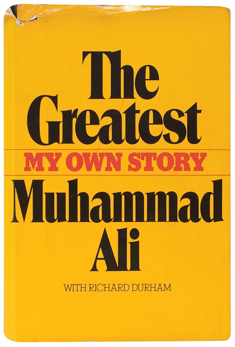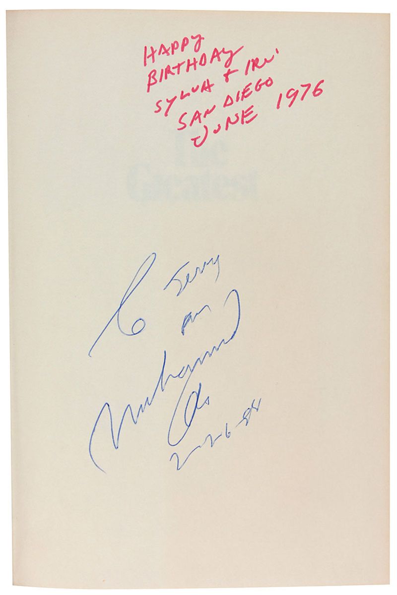 Signed book: The Greatest: My Own Story. First edition. NY: Random House, 1975. Hardcover with dust jacket, 6.25 x 9.5, 415 pages. Signed and inscribed below a gift inscription on the first free end page in blue ballpoint, “To Jerry, from Muhammad Ali, 2-26-84.” A few tears with slight paper loss to the top of the dust jacket, otherwise fine condition.