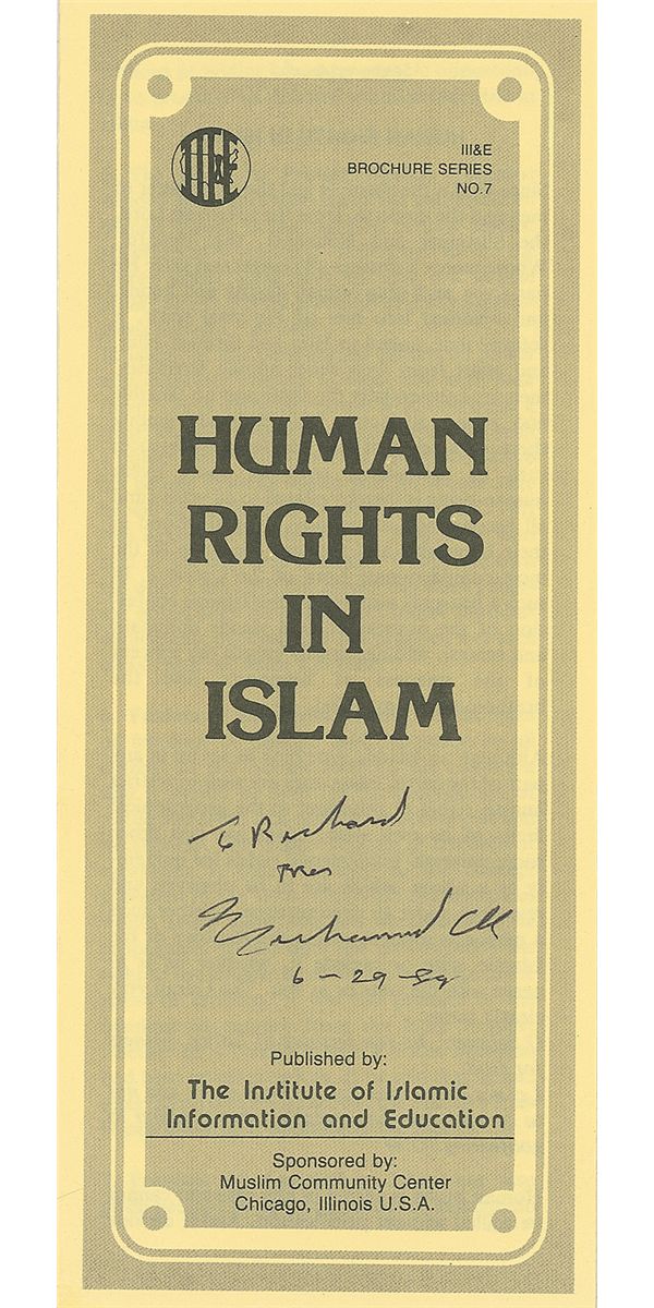 Religious pamphlet entitled ‘Human Rights in Islam,’ 3.5 x 8.5, signed and inscribed in black ballpoint, “To Richard, from Muhammad Ali, 6-29-89.” In very fine condition.
