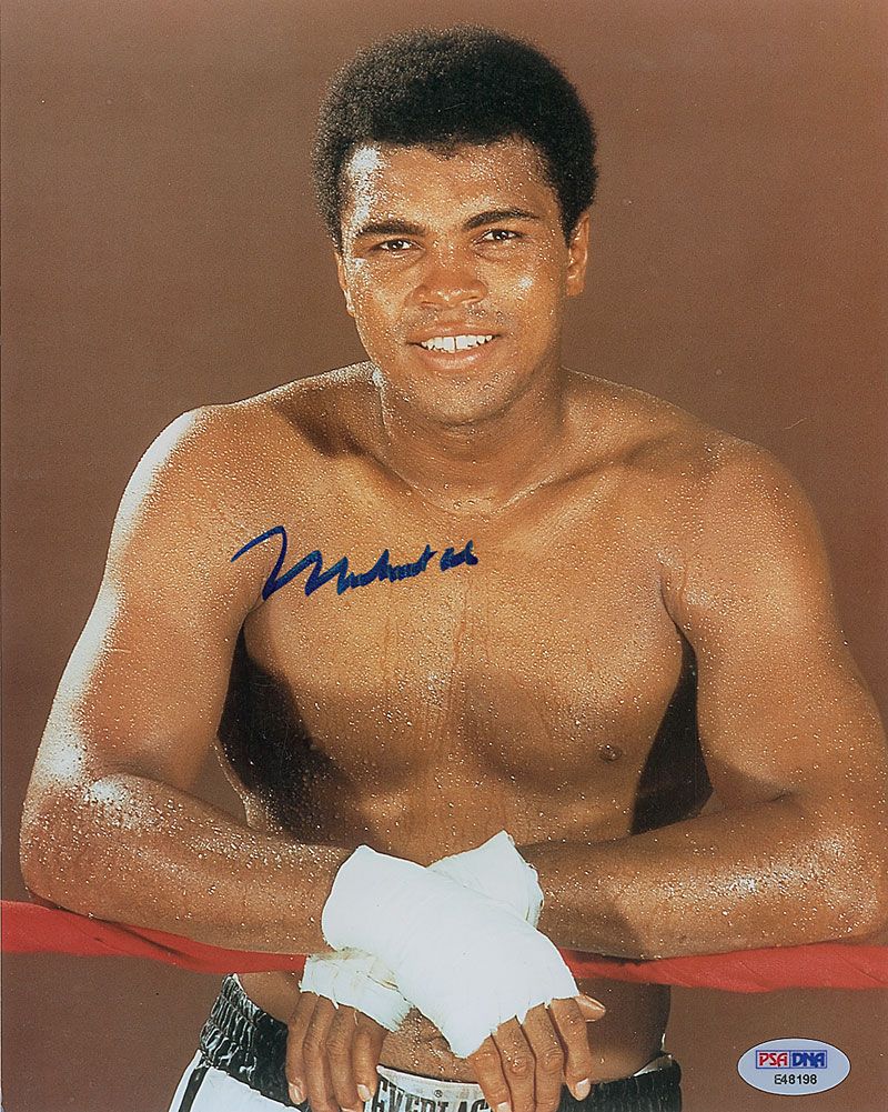 Color glossy 8 x 10 photo of a sweaty Ali leaning on a set of ropes, signed in blue felt tip. In fine condition, with a PSA/DNA authentication label affixed to lower corner. Accompanied by a full letter of authenticity from PSA/DNA.