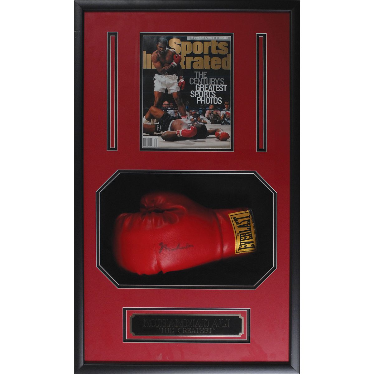 Everlast left-handed boxing glove signed in black felt tip on the top. Shadowboxed and double-matted and framed with a Sports Illustrated cover and a name plaque to an overall size of 20 x 32.5 x 6. In fine condition, with signature lightly faded, but still completely legible. Oversized.