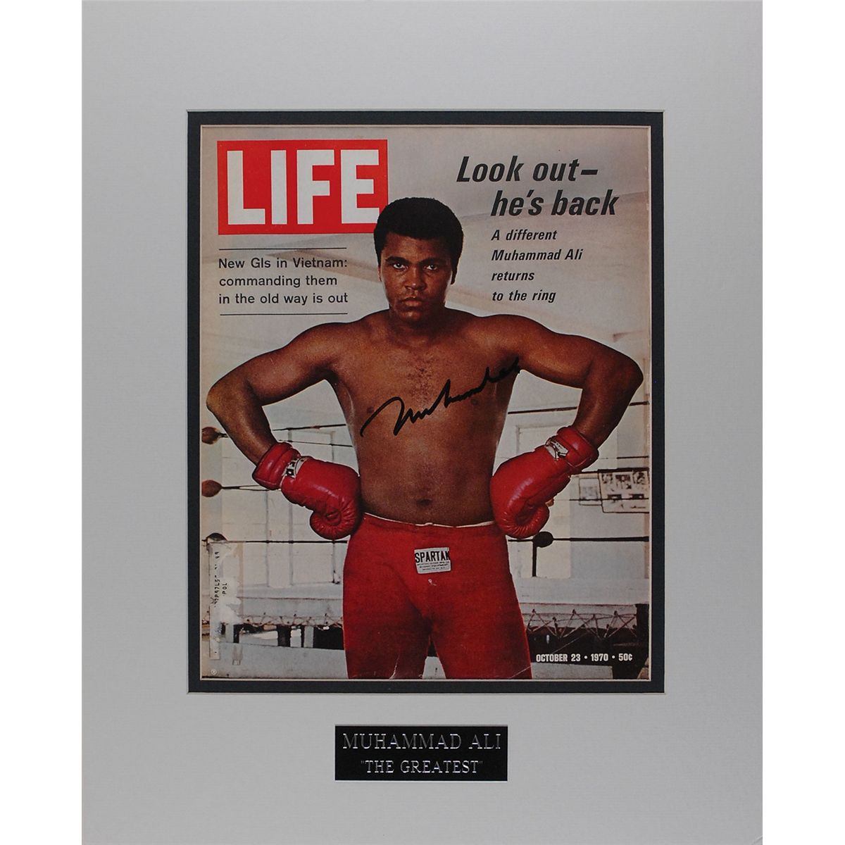 Magazine cover from the October 23, 1970, issue of Life, featuring an intense-looking Ali in the gym, signed in black felt tip. Double-matted to an overall size of 16 x 20. In fine condition, with label remnants to lower left and a few light creases.