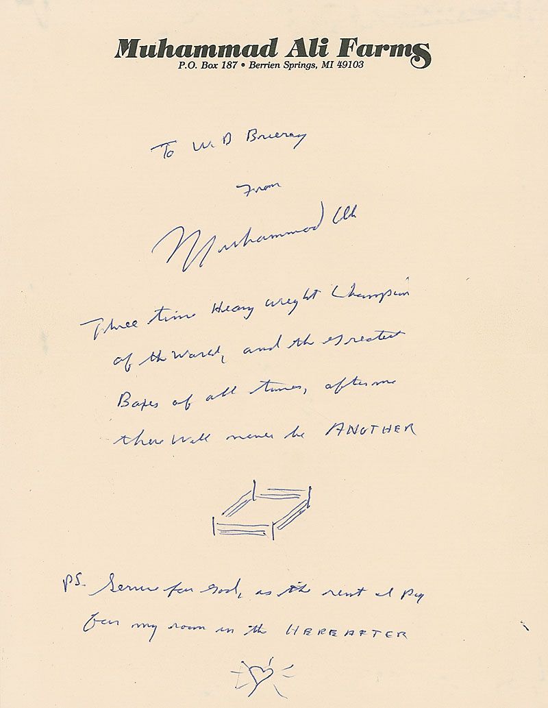 AQS on an off-white 8.5 x 11 sheet of Muhammad Ali Farms stationery. Ali writes, “To W. D. Brieray from Muhammad Ali. Three time Heavy Weight Champion of the world and the greatest boxer of all time, after me there will never be another. PS. Service for God is the rent I pay for my room in the hereafter.” Ali also adds a small sketch of a boxing ring and heart to the sheet. In fine condition. Accompanied by a photocopied letter of authenticity from James Spence.