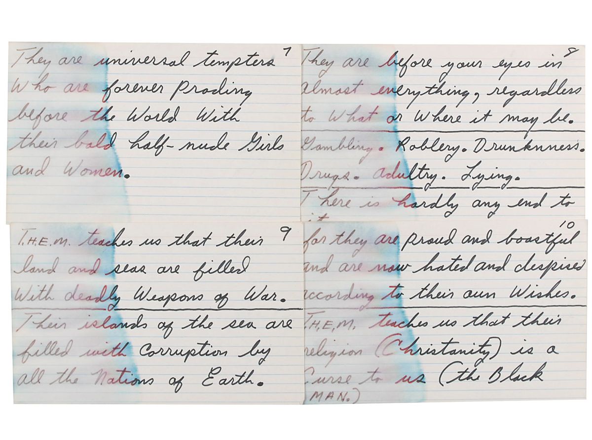 Handwritten notes on four off-white 8 x 5 lined cards, no date. Alarming notes for a religious speech. In part: “They are universal tempters who are forever proding before the world with their bold half-nude girls and women…Gambling. Robbery. Drunkenness. Drugs. Adultery. Lying. There is hardly any end to it…their land and seas are filled with deadly weapons of war…they are proud and boastful and are now hated and despised according to their own wishes. T.H.E.M. teaches us that their religion (Christianity) is a curse to us (the Black MAN).” Dampstaining to left side of all cards (affecting appearance but not legibility), otherwise fine condition.