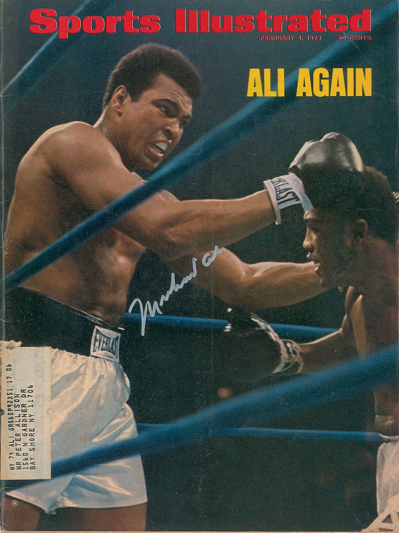 Sports Illustrated magazine, dated February 4, 1974, featuring Ali in the ring on the cover, signed on the front cover in silver ink. In fine condition, with mailing label affixed to left side of cover, and some light toning to inside pages.