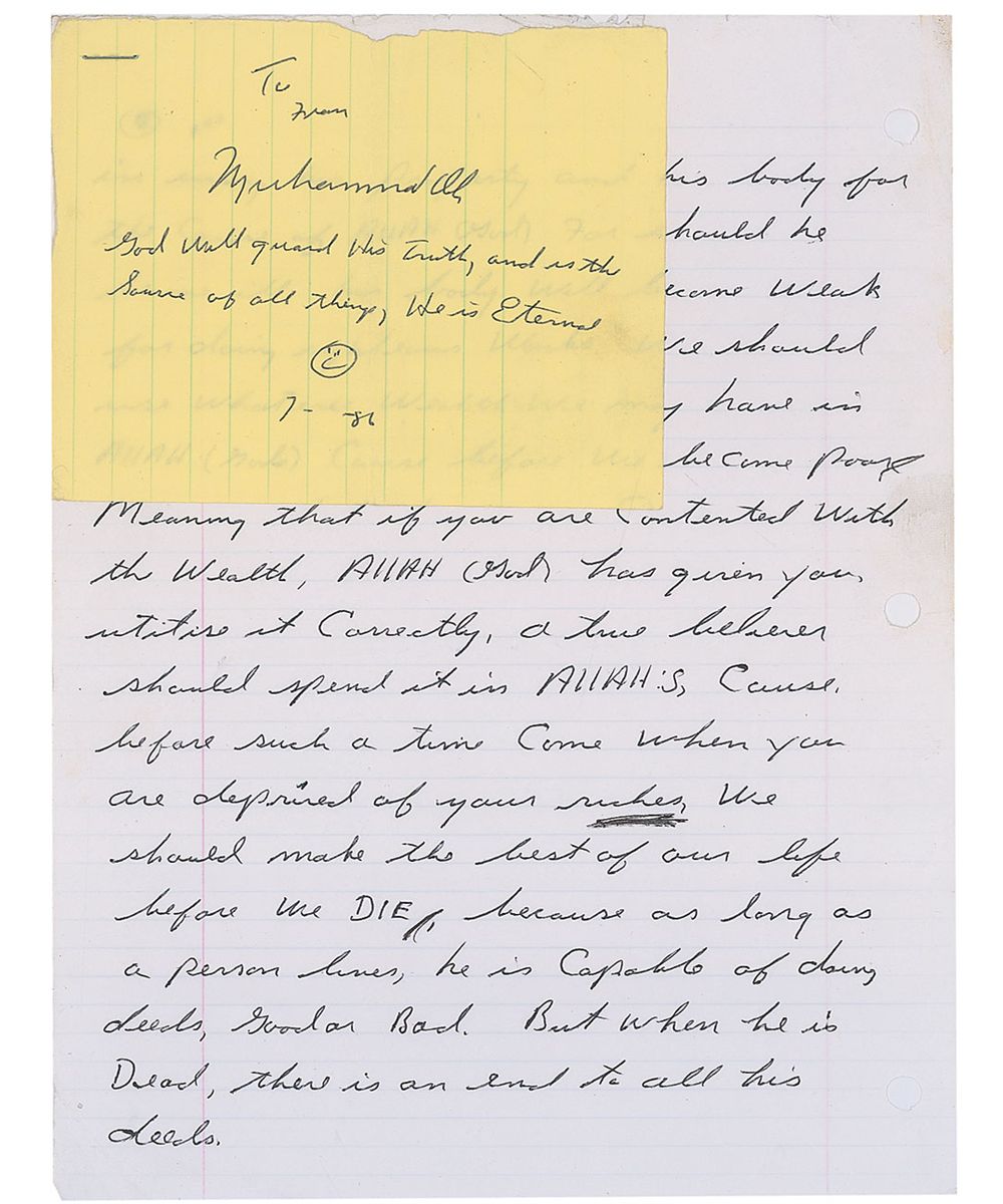 Autograph manuscript, one lightly-lined page, 8 x 10.5, taken from a longer manuscript. Ali writes, in part: “If you are contented with the wealth Allah (God) has given you, utilise it correctly, a true believer should spend it in Allah’s cause, before such a time comes when you are deprived of your riches, we should make the best of our own life before we die, because as long as a person lives, he is capable of doing deeds, good or bad. But when he is dead, there is an end to all his deeds.” Stapled to the front is a ballpoint signature and inscription, “To Fran, Muhammad Ali, God will guard His Truth, and is the Source of all things, He is Eternal, 7–86,” on a yellow 5.5 x 4 lined slip, adding a small happy face at the bottom. Scattered creases and wrinkles, otherwise fine condition. Accompanied by a letter of authenticity from James Spence.