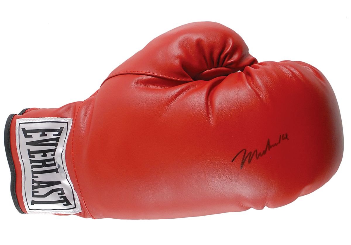 Red Everlast right-handed 16-ounce boxing glove signed on the top in black felt tip. In fine condition, with a Steiner Sports label affixed to the wrist. Accompanied by a certificate of authenticity from Steiner Sports.