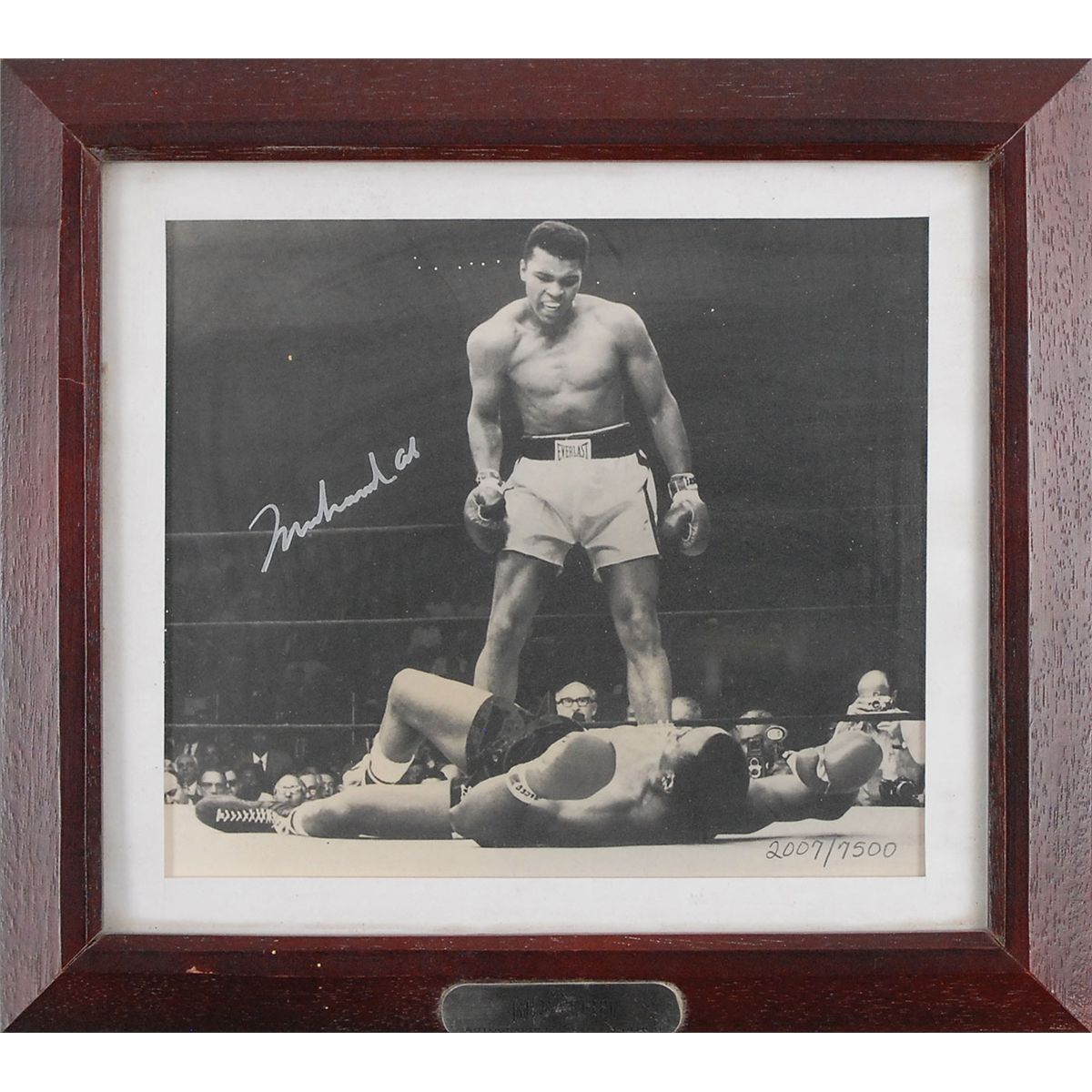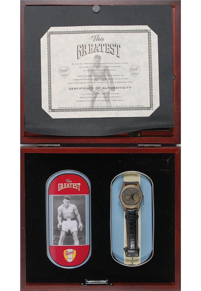 Limited edition analog wristwatch by Fossil, numbered 2007/7500, housed in its original 9.25 x 8.25 wooden display box, which features a 6.5 x 5.75 photo of Ali standing over Sonny Liston, signed in silver ink by Ali. In fine condition, with some light peeling to label on box. Watch appears unused.
