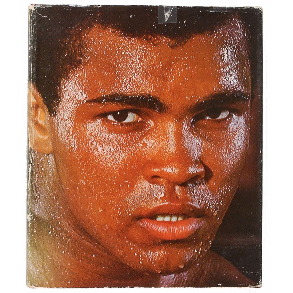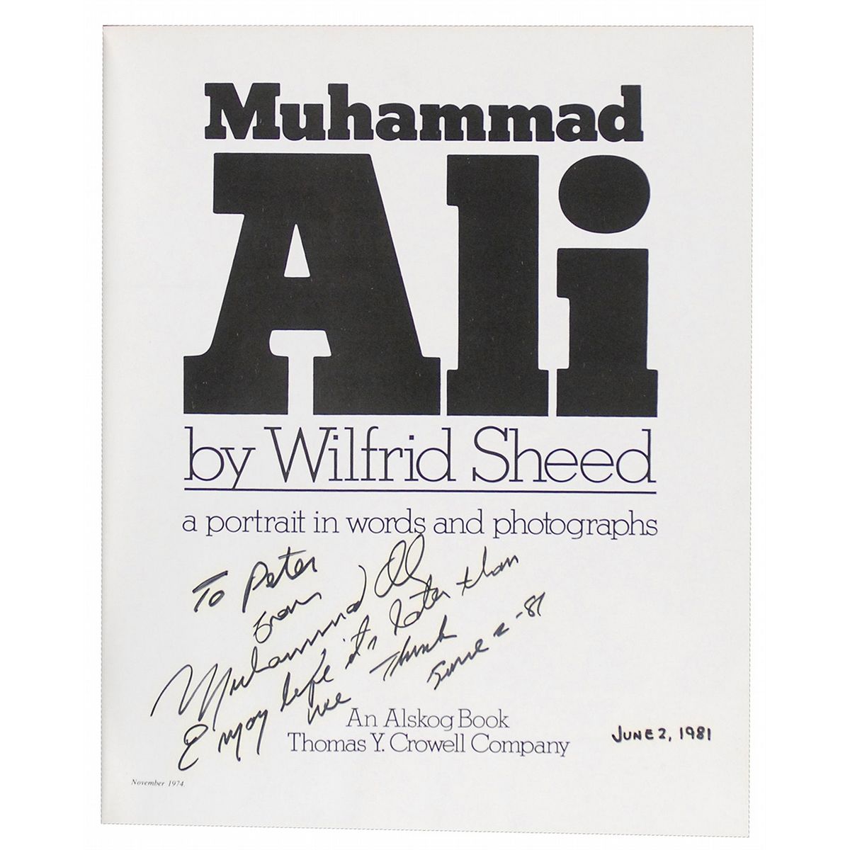 Signed book: Muhammad Ali by Wilfrid Sheed. Later printing. NY: Thomas Y. Crowell Co., 1975. Hardcover with dust jacket, 9.5 x 11.25. Signed and inscribed on the title page in black felt tip, “To Peter, from Muhammad Ali. Enjoy life it’s later than you think, June 2 ’81.” Page also bears a date notation in another hand. A few tape repaired tears to dust jacket and noticeable haloing to signature and inscription, otherwise fine condition. Book condition: VG/VG-.