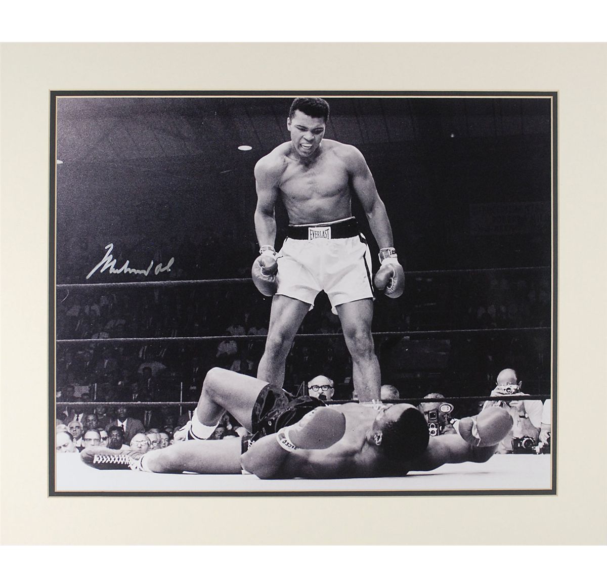 Imposing satin-finish 19.5 x 15.5 photo of Ali standing over a fallen Sonny Liston, signed in silver ink. Double-matted to an overall size of 24 x 20. In fine condition.