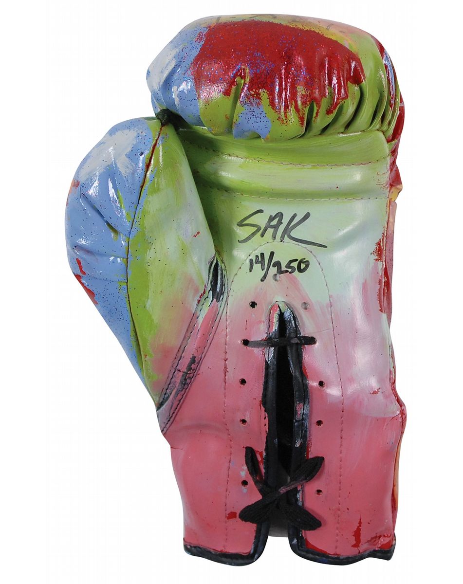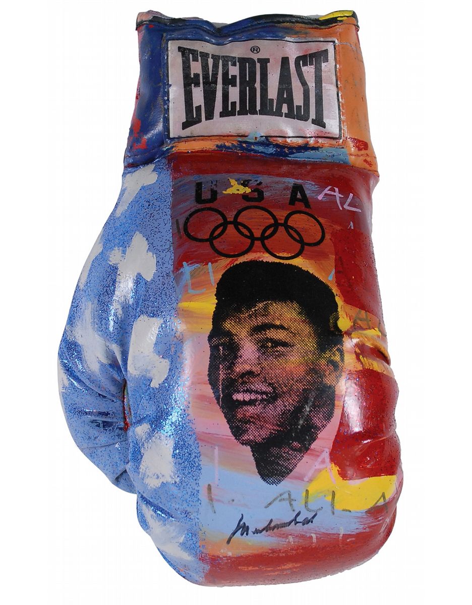 Striking one-of-a-kind limited edition hand-painted Everlast 14-ounce left-handed boxing glove, done by renowned pop artist Steven Kaufman (a protege of Andy Warhol), numbered 14/250, signed on the top in black felt tip by Ali, and also initialed on the back in black felt tip by Kaufman. The glove, highlighted in red, greens, and blue, is accented by a youthful image of Ali under the Olympic rings. The unsigned companion glove has a printed tribute to the 1960 Olympic gold medal winner, listing the bouts and the opponents he defeated. In very fine condition.