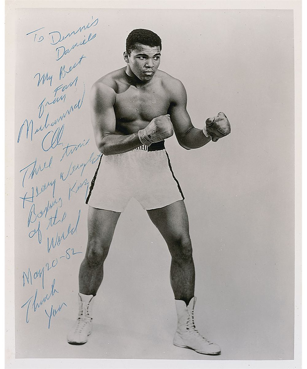 Glossy 8 x 10 full-length photo, signed and inscribed in blue ballpoint, “To Dennis Daniels, My best fan, Muhammad Ali, Three time Heavy Weight Boxing King of the World, May 20-82, Thank you.” In fine condition, with some scattered light creases and surface marks. Accompanied by a letter of authenticity from James Spence. Dennis Daniels was a British semi-professional featherweight boxer.