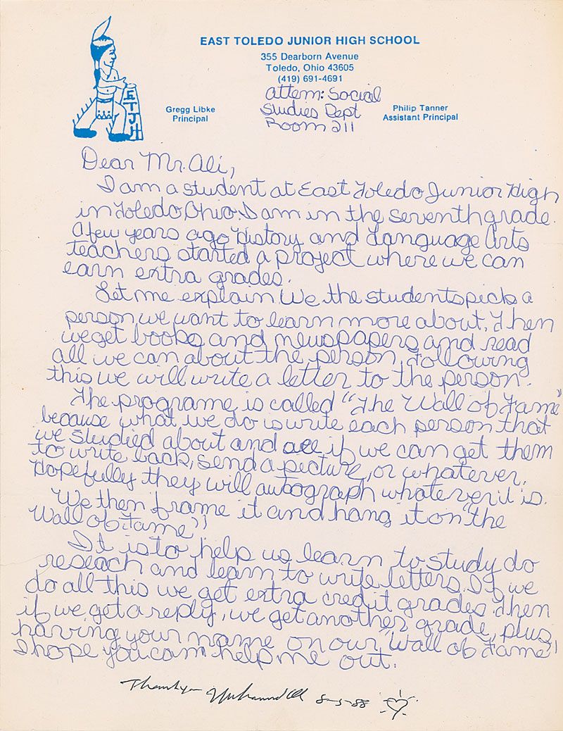 Ballpoint signature, “Thank you, Muhammad Ali 8-5-88,” adding a small sketch of a heart after the date, on an off-white 8.5 x 11 sheet of East Toledo Junior High School stationery bearing a letter to Ali from a student asking him to join their ‘Wall of Fame.’ In fine condition.