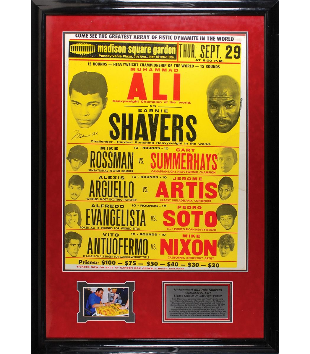 Color 23 x 29 on-site fight poster for the September 29, 1977, bout between Ali and Ernie Shavers at Madison Square Garden, signed in black felt tip by Ali. Double-suede-matted and framed with a descriptive plaque and a photo of Ali taken at the time of the private signing to an overall size of 30.5 x 44. In very good condition, with scattered foxing and dampstaining, a central horizontal crease, and a few other scattered creases. Oversized.