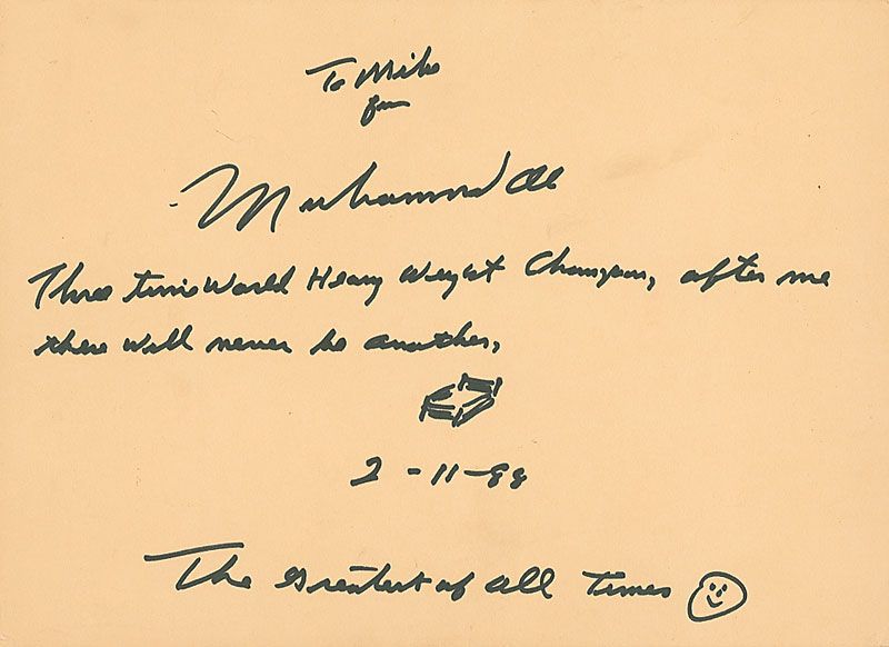 Large and highly desirable AQS on an 11.75 x 8.5 manila folder, signed and inscribed in black felt tip, “To Mike, from Muhammad Ali, Three time Heavy Weight Champion, after me there will never be another. 2-11-88. The Greatest of All Time,” with Ali adding sketches of a boxing ring and a smiley face below. In fine condition.