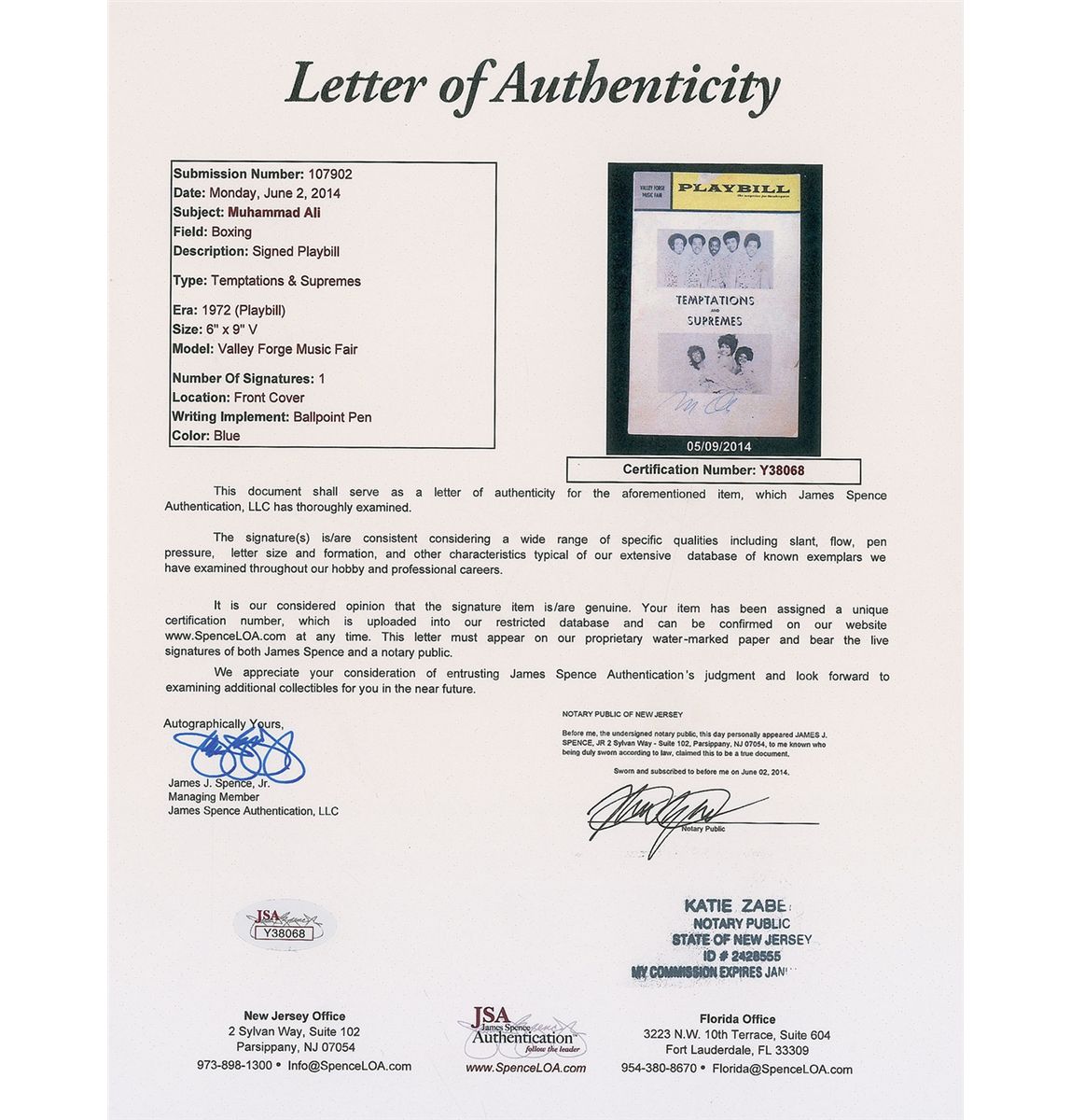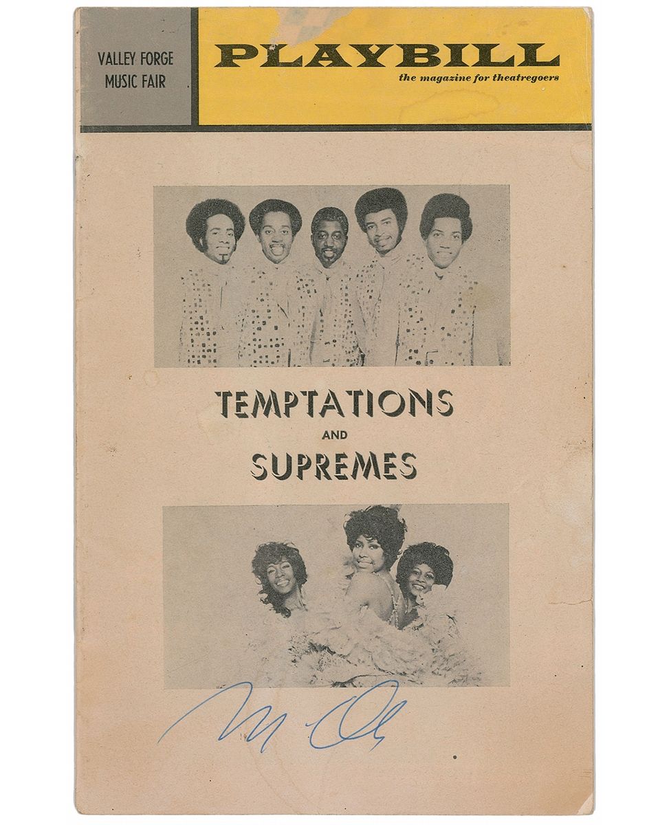 Plabill for a performance by the Temptations and Supremes at the 1972 Valley Forge Music Fair, 5.75 x 9, signed on the front cover in blue ballpoint, “M. Ali.” In very good condition, with a bit of surface loss to the top of the cover, small tear to right edge, and a few mild stains (including a ring affecting the first letter of his signature). Accompanied by a full letter of authenticity from JSA.