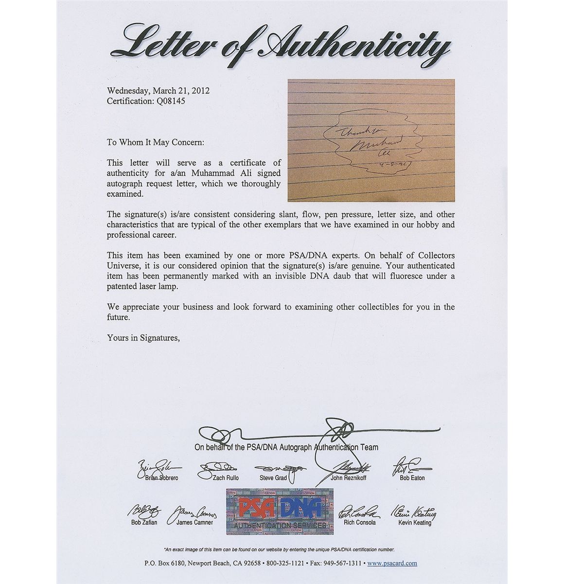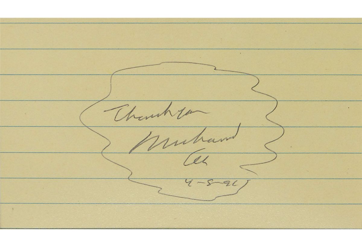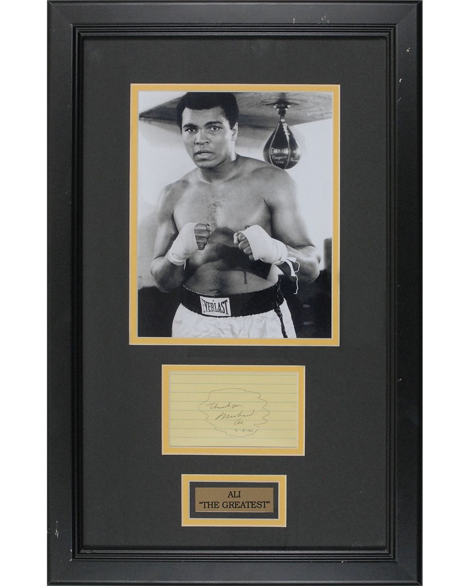 Ballpoint signature, “Thank you, Muhammad Ali, 4-5-91,” on a lined 5 x 3 card. Nicely double-matted and framed with a photo and nameplate to an overall size of 14.5 x 22.5. In fine condition. Accompanied by a full letter of authenticity from PSA/DNA.