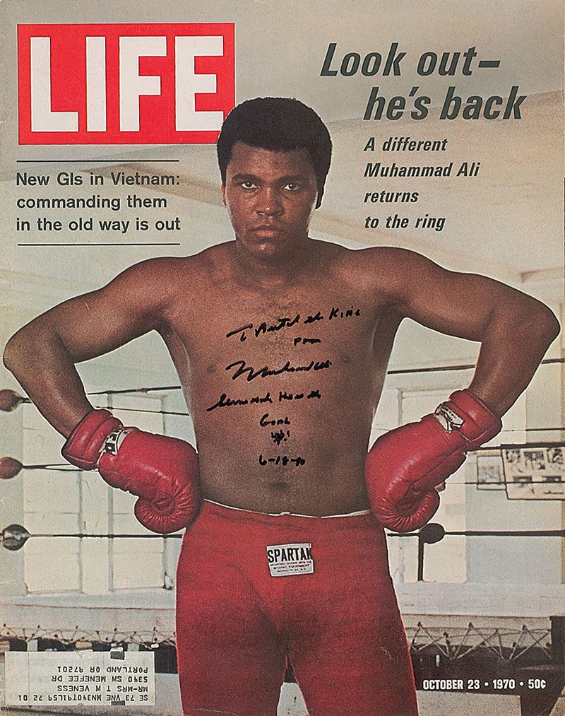 Life magazine, dated October 23, 1970, featuring an imposing image of Ali on the cover, signed and inscribed in black felt tip, “To Butch the King from Muhammad Ali, Serve God, He is the goal 6-18-90,” adding a small sketch of a heart. In fine condition, with mild handling wear and a mailing label affixed to lower left.