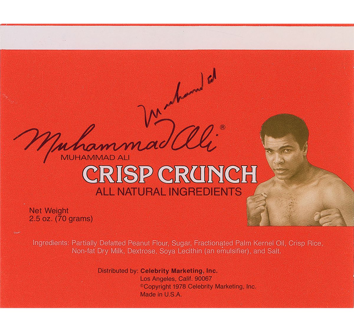 Unused wrapper for the Muhammad Ali Crisp Crunch candy bar, 6.25 x 5, signed in black felt tip. In fine condition. Accompanied by a full letter of authenticity from James Spence.