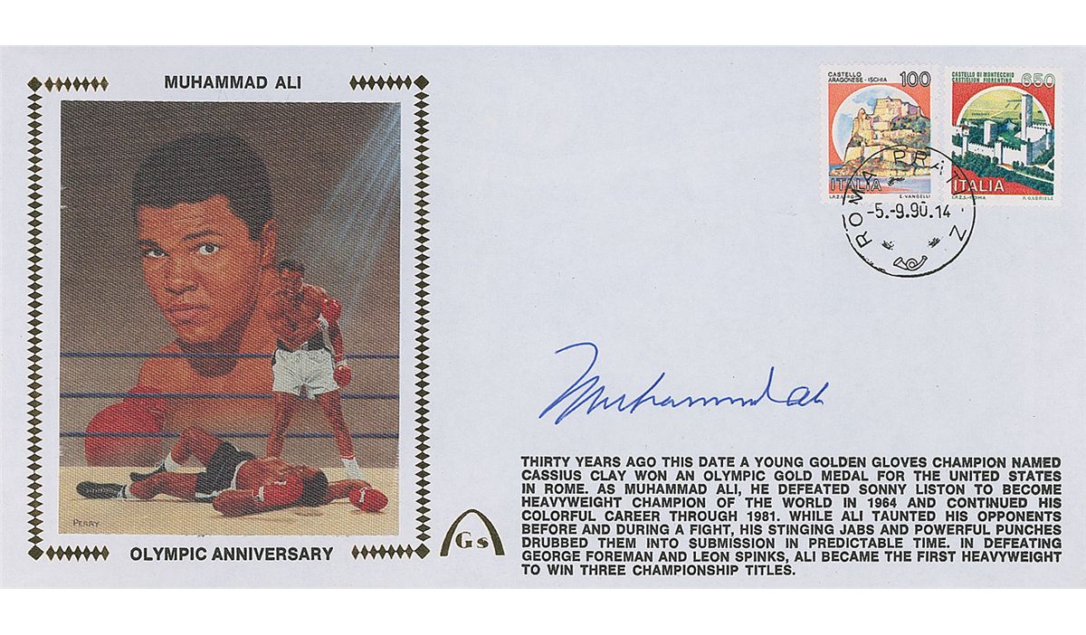 Gateway commemorative cover, 9.5 x 4.5, with a color silk cachet honoring Ali’s Olympic anniversary, signed in blue ballpoint. In very fine condition.
