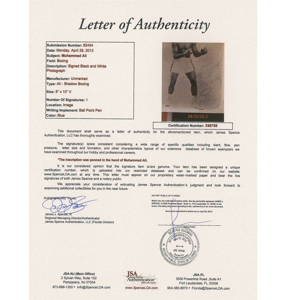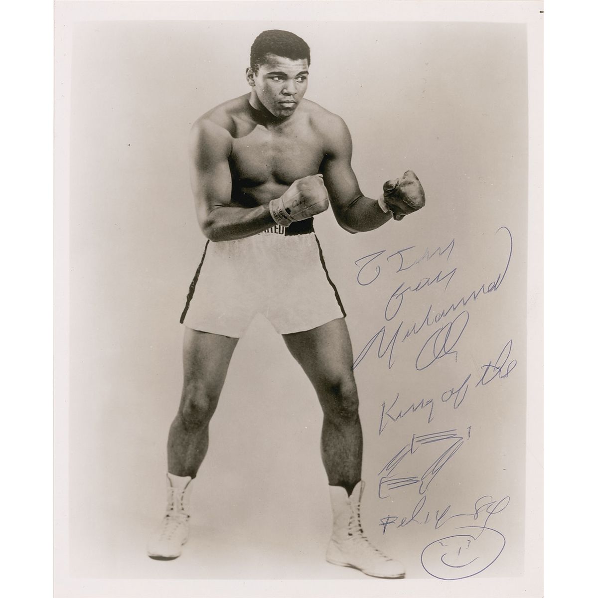 Glossy 8 x 10 full-length photo of Ali in a fighting position, signed and inscribed in black ballpoint, adding “King of the [sketch of a boxing ring], Feb. 14, 84,” concluding with a smiley face sketch. In very fine condition. Accompanied by a full letter of authenticity from JSA. A desirable and nicely inscribed example from the self-proclaimed ‘King of the Ring.’