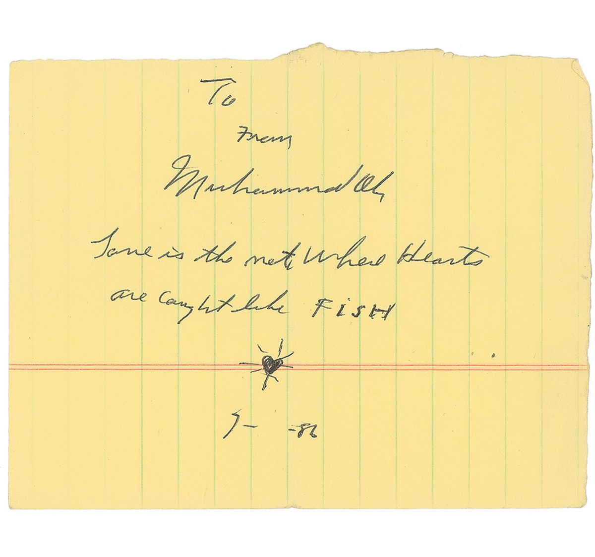 Ballpoint signature, “To, From Muhammad Ali, Love is the net where Hearts are caught like FISH, 7- -86,” on a lined yellow 5.5 x 4.25 slip. Ali apparently prepared this autograph in advance and planned to complete the inscription and date on a later occasion. In fine condition, with a central vertical fold and rough edges.