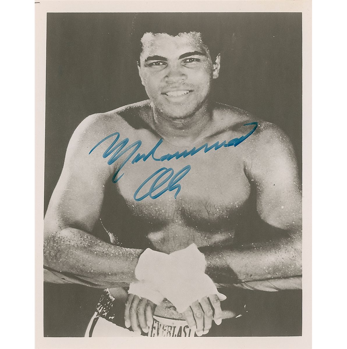 Choice glossy 8 x 10 photo of Ali posing at the side of the ring, prominently signed in black felt tip during the early 1980s. In fine condition.