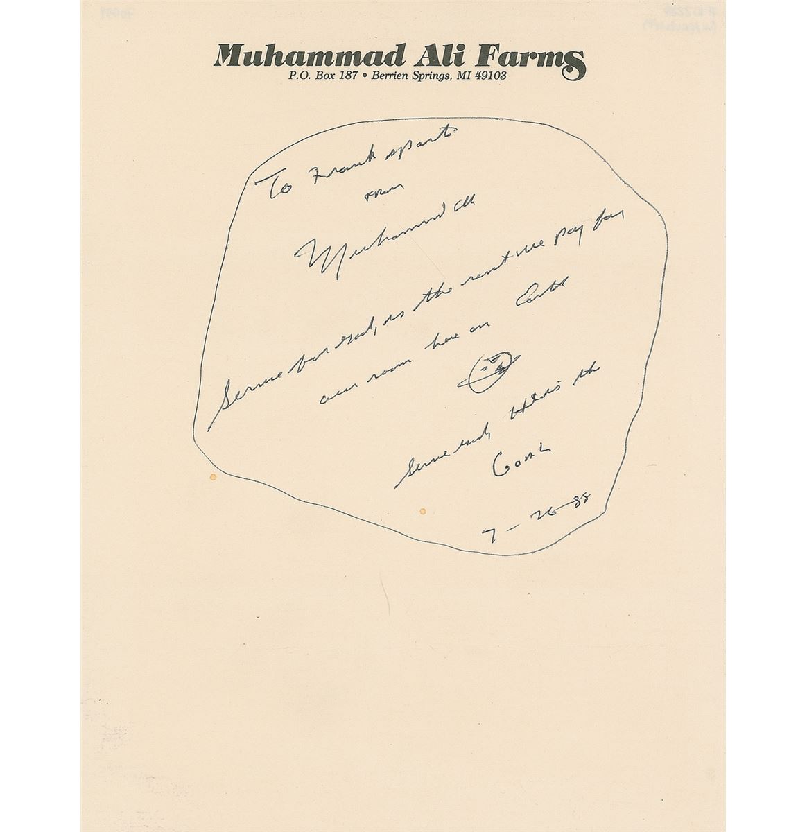 AQS on an off-white 8.5 x 11 sheet of Muhammad Ali Farms letterhead, signed and inscribed within a hand-drawn ring in black ballpoint, “To Frank Sparti, from Muhammad Ali, Service for God, is the rent we pay for our room on Earth, Serve God, He is the Goal, 7–26–88,” with a small sketch of Earth incorporated into the quote. In fine condition, with two small spots of soiling. Accompanied by the original mailing envelope, addressed in Ali’s own hand.