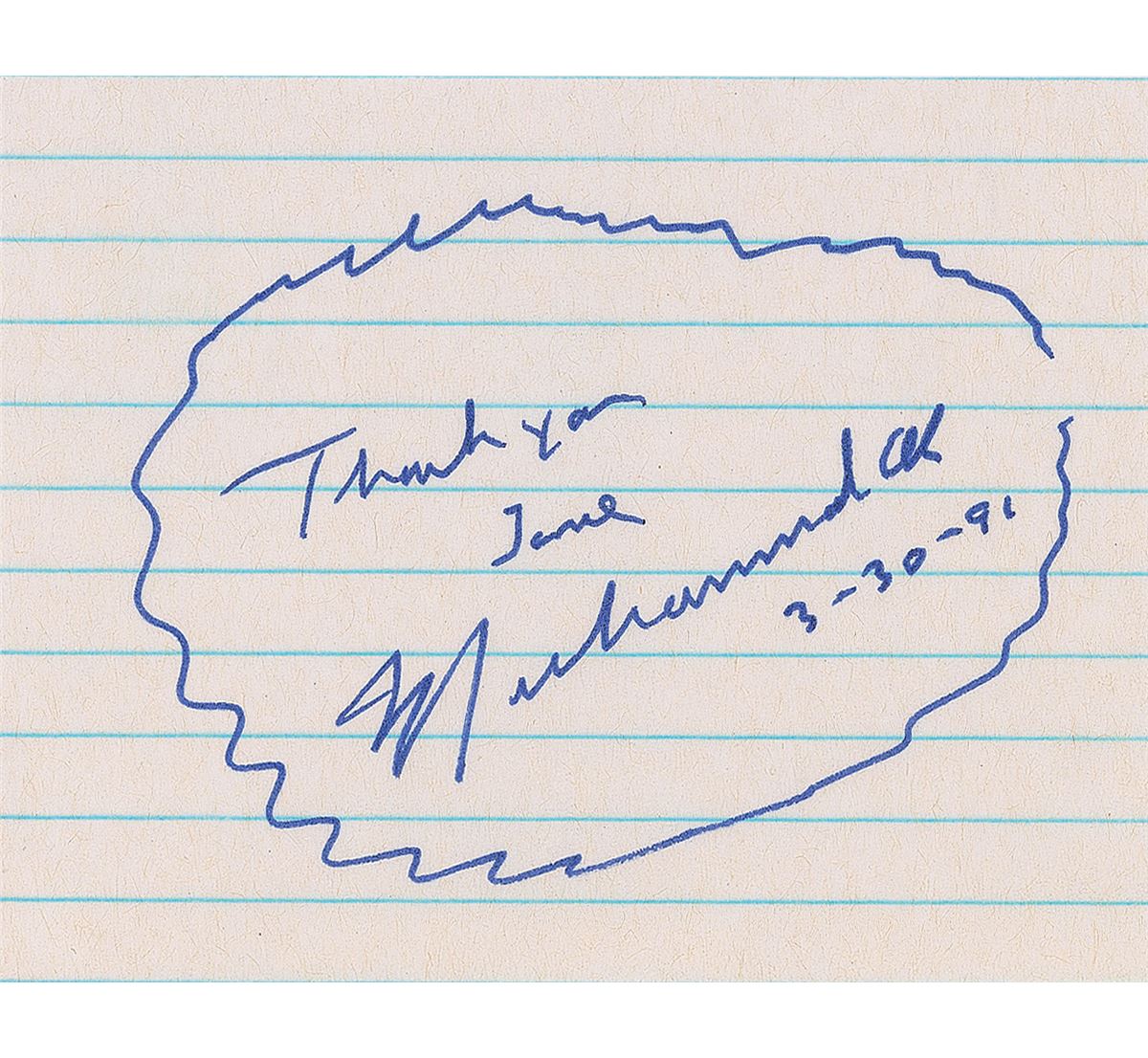 Ink signature, “Thank you, Love Muhammad Ali, 3–30–91,” on an off-white 4 x 3.25 lightly-lined slip clipped from a larger sheet. In fine condition.