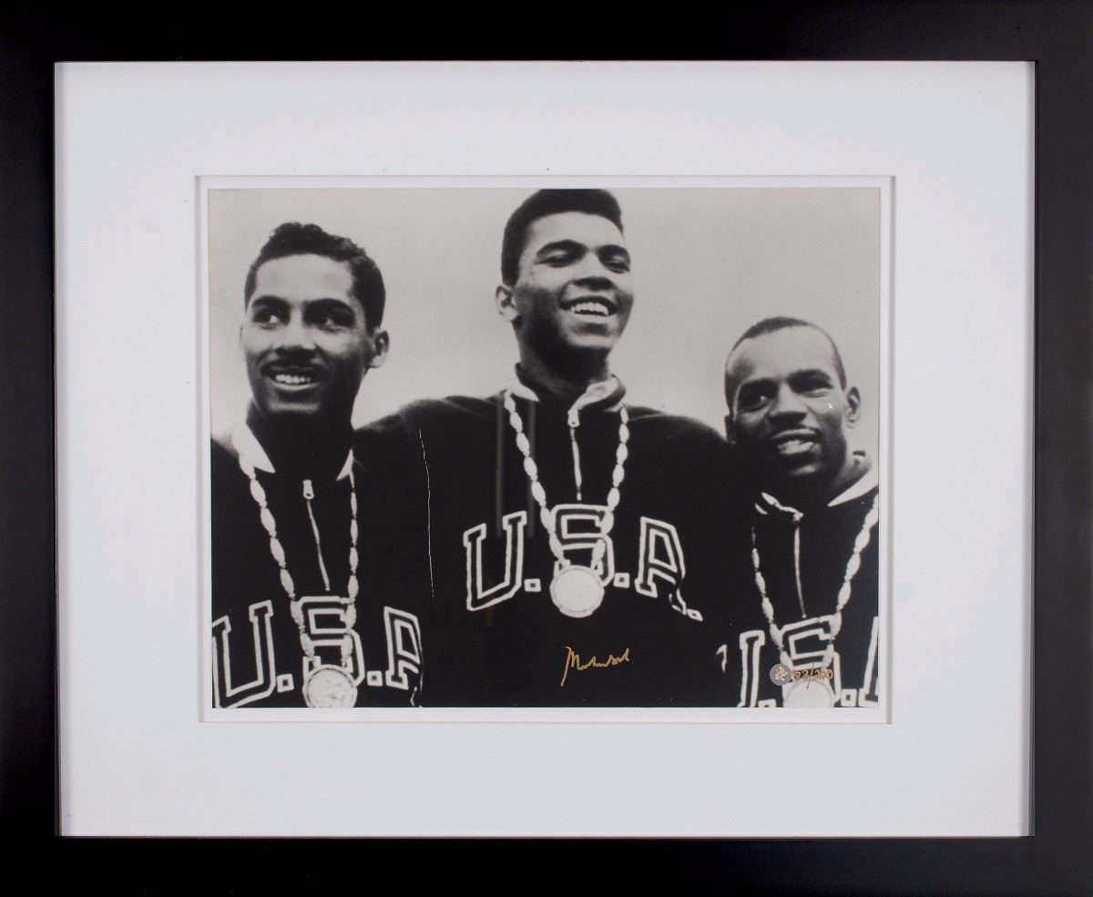 Limited edition glossy 13.5 x 10.5 photo of Ali posing with Wilbert McClure and Eddie Crook Jr., at the 1966 Rome Olympics, numbered 83/200, signed in gold ink. Double-matted and framed to an overall size of 22 x 18. Slight creasing (noticeably between Ali and McClure), slight toning to edges, a nick to the cheek of Crook (seemingly inherent to the original negative), and an All-American authenticity label affixed to lower right, otherwise fine condition.