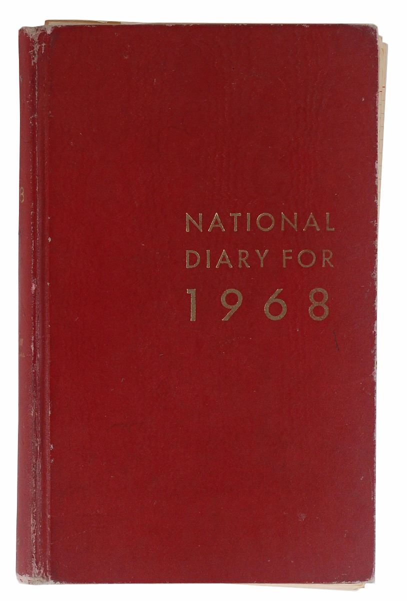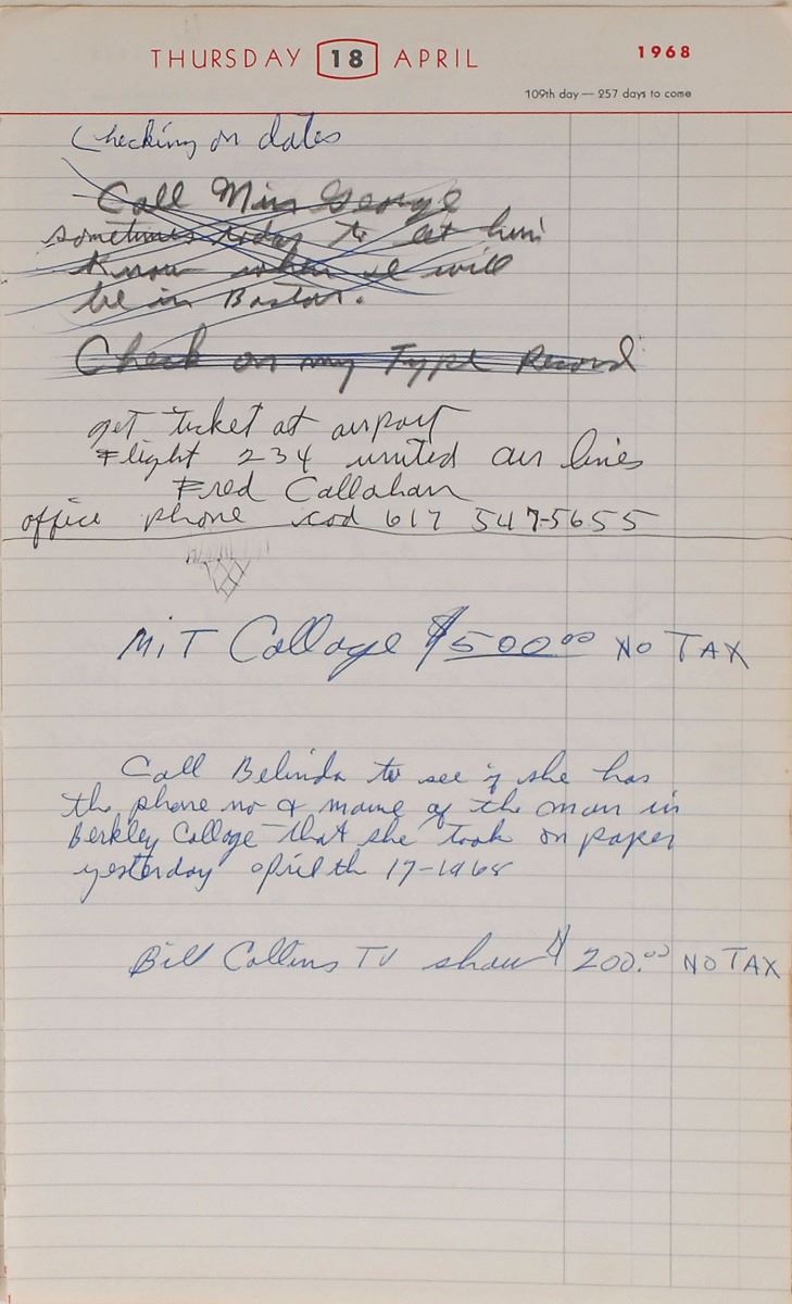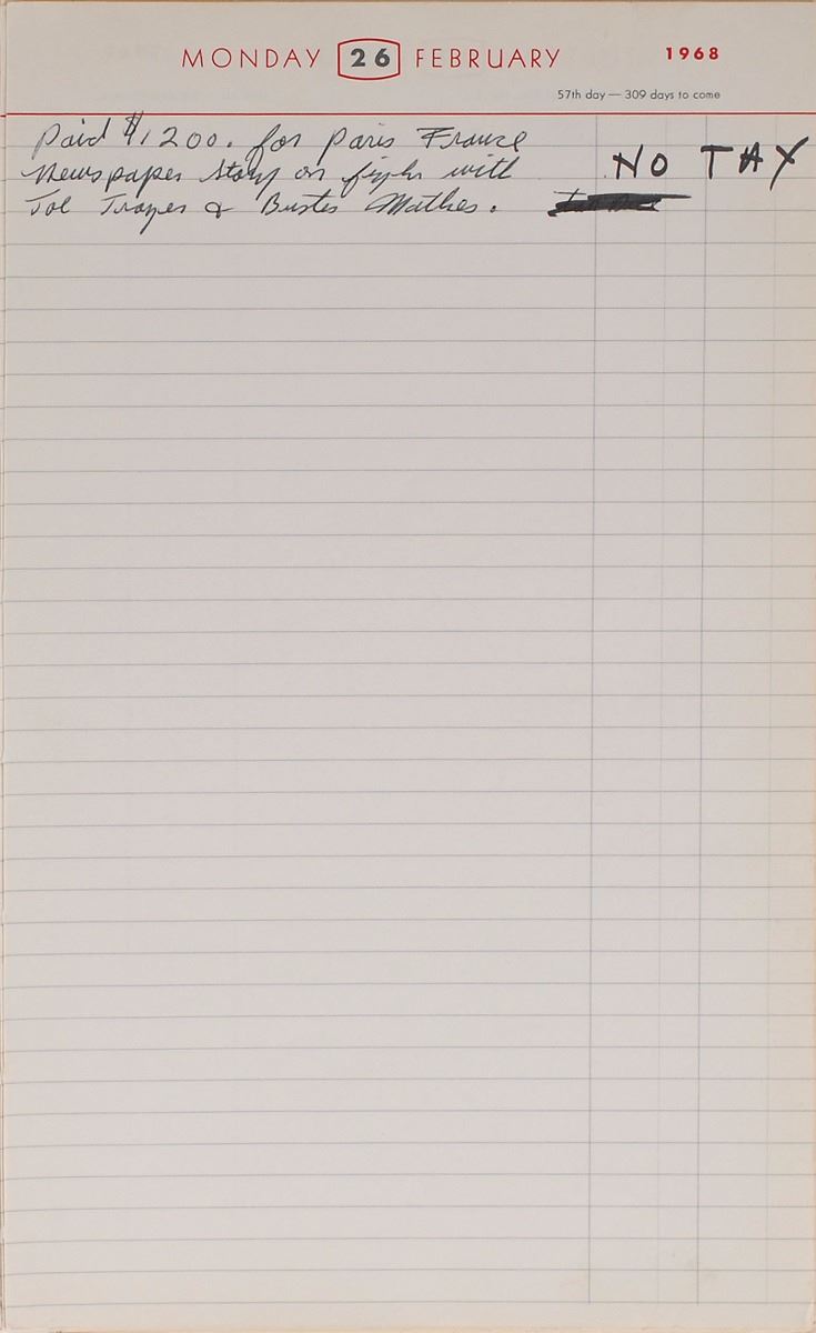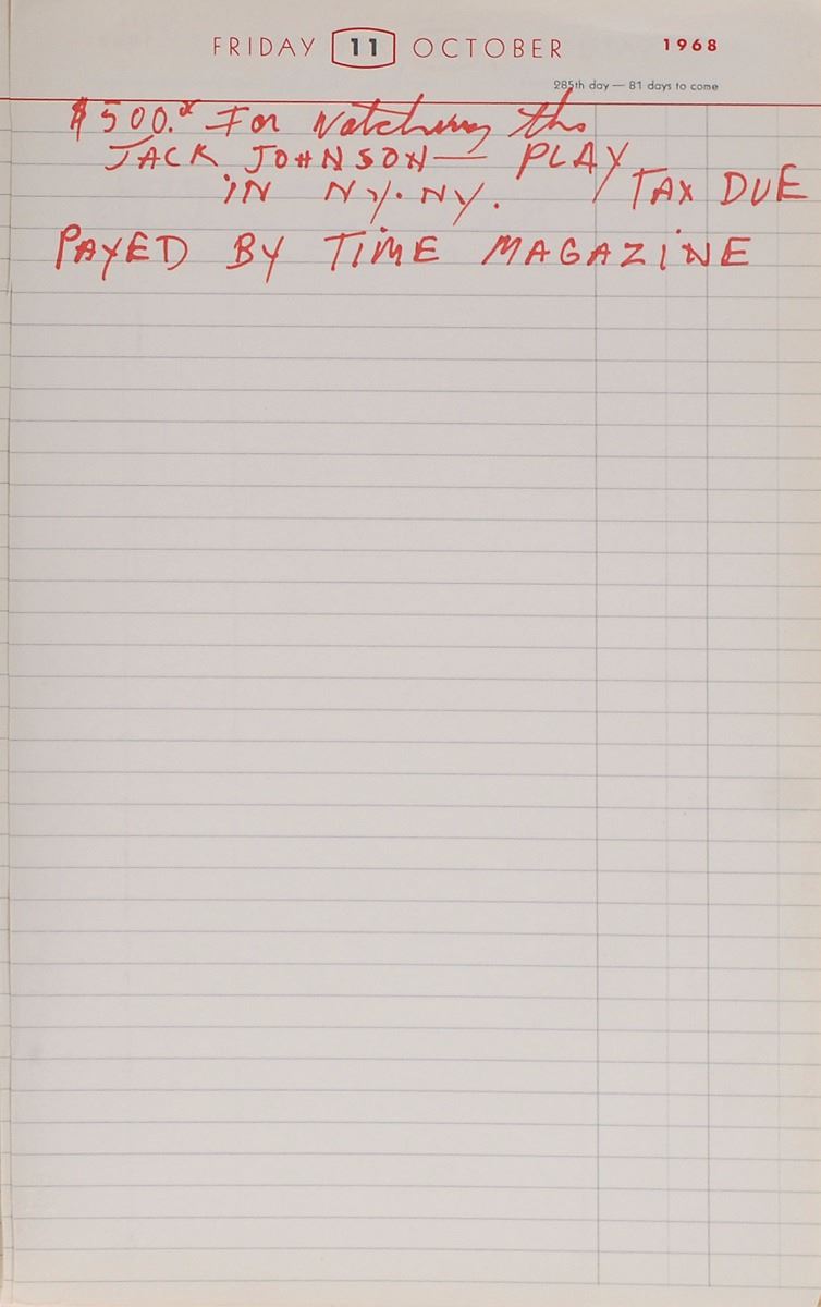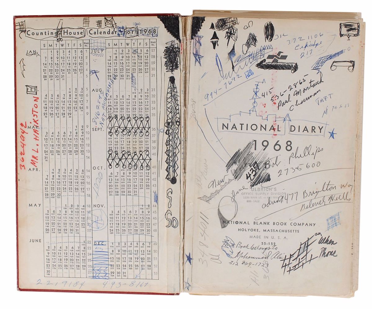 Ali’s personal day planner from 1968, the cover reading, “National Diary for 1968,” over 360 pages, 8 x 12.75, containing writing on more than half the pages with over 1800 words in Ali’s hand. Many also have entries in other hands, possibly by his wife Belinda Ali. Many of the entries involve events, schedules, and financial transactions. Ali writes his own name in two instances, once on the title page, “Book belongs to Muhammad Ali,” and once on March 13, “Book written on Muhammad Ali, $6.00.” A few of Ali’s entries refer to his fellow boxers (spelling and grammar retained): February 26, “Paid $1200. for Paris France newspaper Story on fight with Joe Frazier & Buster Mathes”; September 15, “Esard Charles is dieing. have something for him, try to be there, I have OKed it”; October 27, “E. Charles…Dinner in his honor. try to be there. in Chicago place not known yet”; October 10, “$500 for watching the Jack Johnson Play in NY. NY. Payed by Time Magazine.” Based on the first item here, Ali must have contributed some ‘insider’ analysis to a Paris newspaper concerning the upcoming World Heavyweight Championship bout between Buster Mathis and Joe Frazier—Ali’s claim to the title had been vacated the previous year after he refused to enter the draft for the Vietnam War. Later on in 1968, the great boxer and heavyweight champ of the past Ezzard Charles was diagnosed with Lou Gehrig’s Disease. A benefit dinner was held for Charles on November 13, which Ali attended along with six other World Champions, including Rocky Marciano, Henry Armstrong, and Archie Moore.