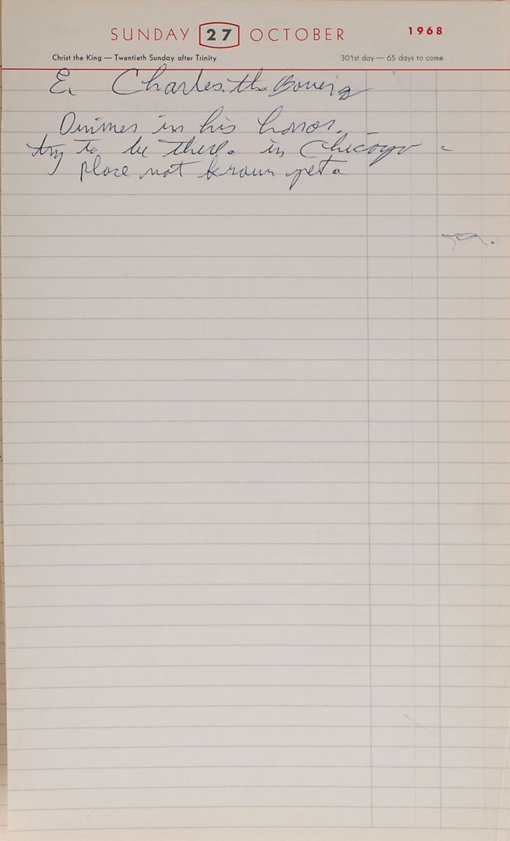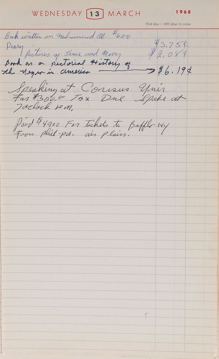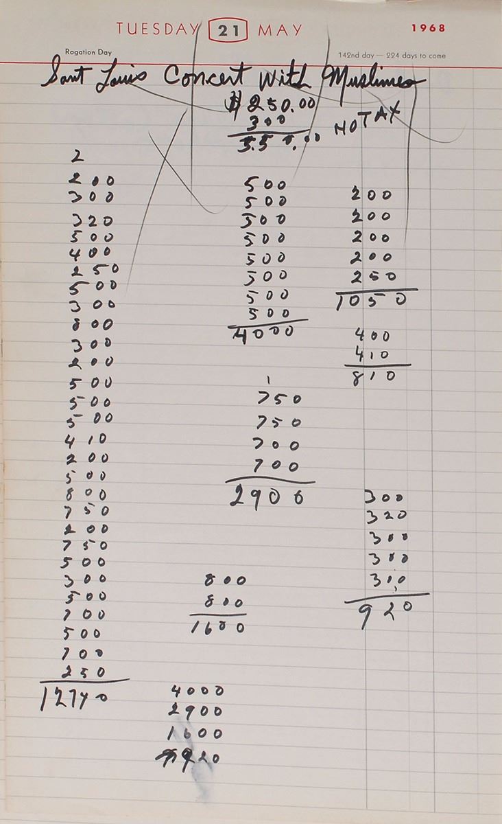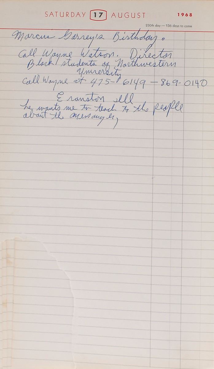 Hints of Ali’s activism are also found throughout, notably in the days following the assassination of Martin Luther King, Jr., on April 4, 1968. Ali was scheduled for five speaking engagements at colleges between April 5–12, all of which he struck through and wrote “Canseled.” He refers to MLK’s younger brother on May 6, writing, “Call A.D. King and Check on the Lou Ky Speech.” On July 13, he writes of his involvement with Jesse Jackson, the head of the SCLC Chicago chapter of the Operation Bread Basket economic initiative, “Orp Bread Basket in Chi with Rev Jackson on south park 46 Streets at 9 oclock .” The theme of black activism past and present continues on August 17, when Ali notes “Marcus Garvey’s Birthday,” and refers to Elijah Muhammad, “Call Wayne Watson Director Black students of Northwestern University Evanston Ill he wants me to teach to the people about the Messenger.” He also mentions several religious events throughout.