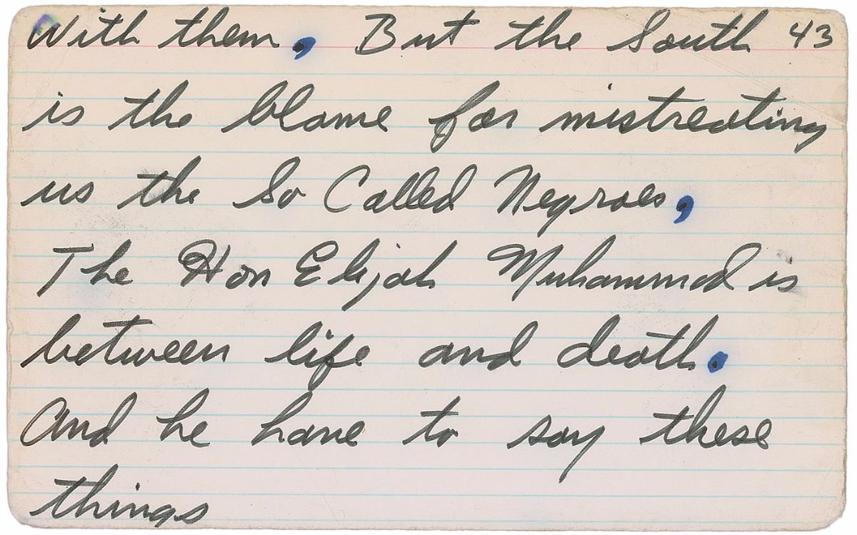 Unsigned handwritten note, one page on a lined 8 x 5 card, no date. Ali’s notes for a religious speech or essay, in part: “But the South is the blame for mistreating us the so called Negroes. The Hon. Elijah Muhammad is between life and death.” In very good condition.