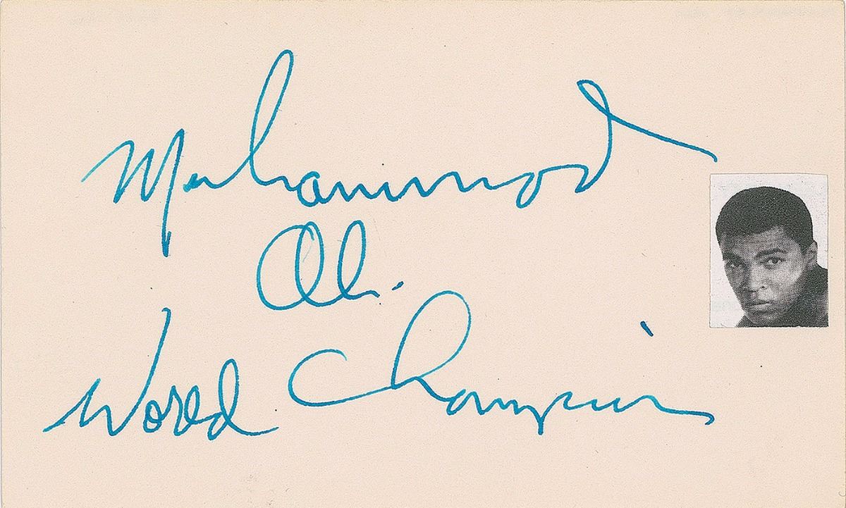 Vintage felt tip signature, “Muhammad Ali, World Champion,” on an off-white 5 x 3 card bearing an affixed image of the champ. In fine condition.