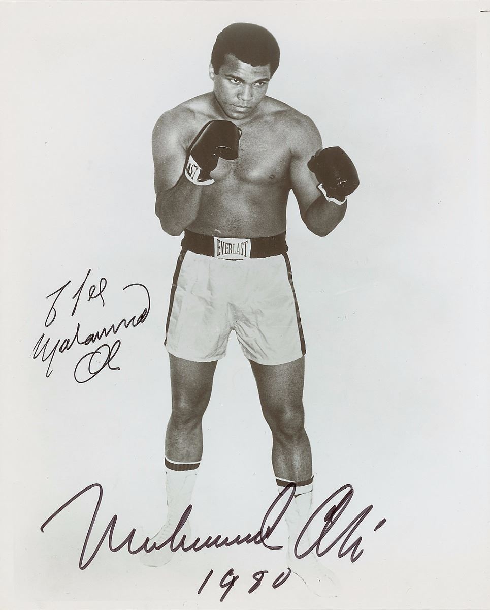 Attractive glossy 8 x 10 full-length photo of Ali in his classic boxing stance, signed and inscribed in black felt tip, “To Ted, Muhammad Ali,” bearing a facsimile signature along the bottom. In fine condition.
