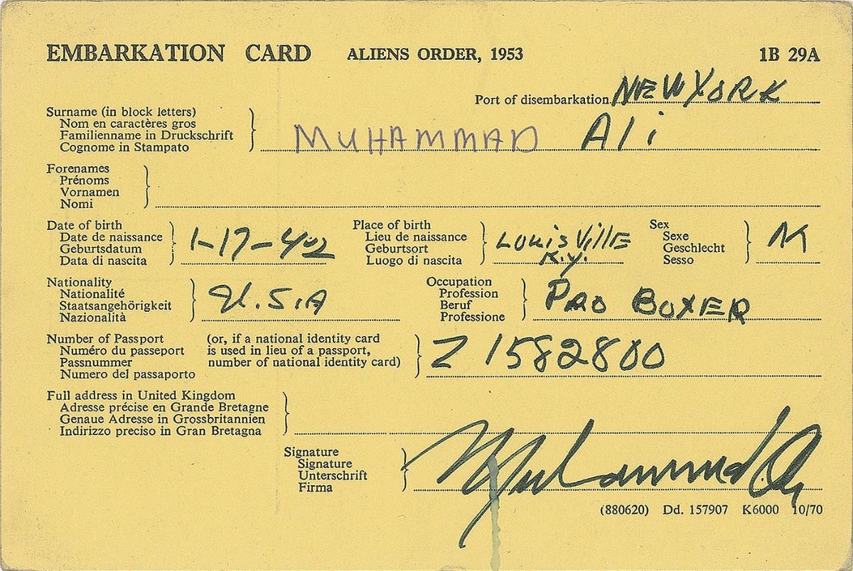 DS, one page, 6 x 4, stamp-dated July 20, 1972. United Kingdom customs embarkation card listing Ali’s personal information, including place and date of birth, sex, nationality, occupation, and passport number. Signed at the conclusion in black felt tip. In fine condition, with a thin ink mark passing through the fist letter of Ali’s signature. Accompanied by an unsigned International Vaccination certificate listing Ali as the traveler. The 30-year-old heavyweight champ Ali defeated his longtime sparring partner Alvin Jones in a non-title fight at Croke Park in Dublin, Ireland just a day before this card was stamped.