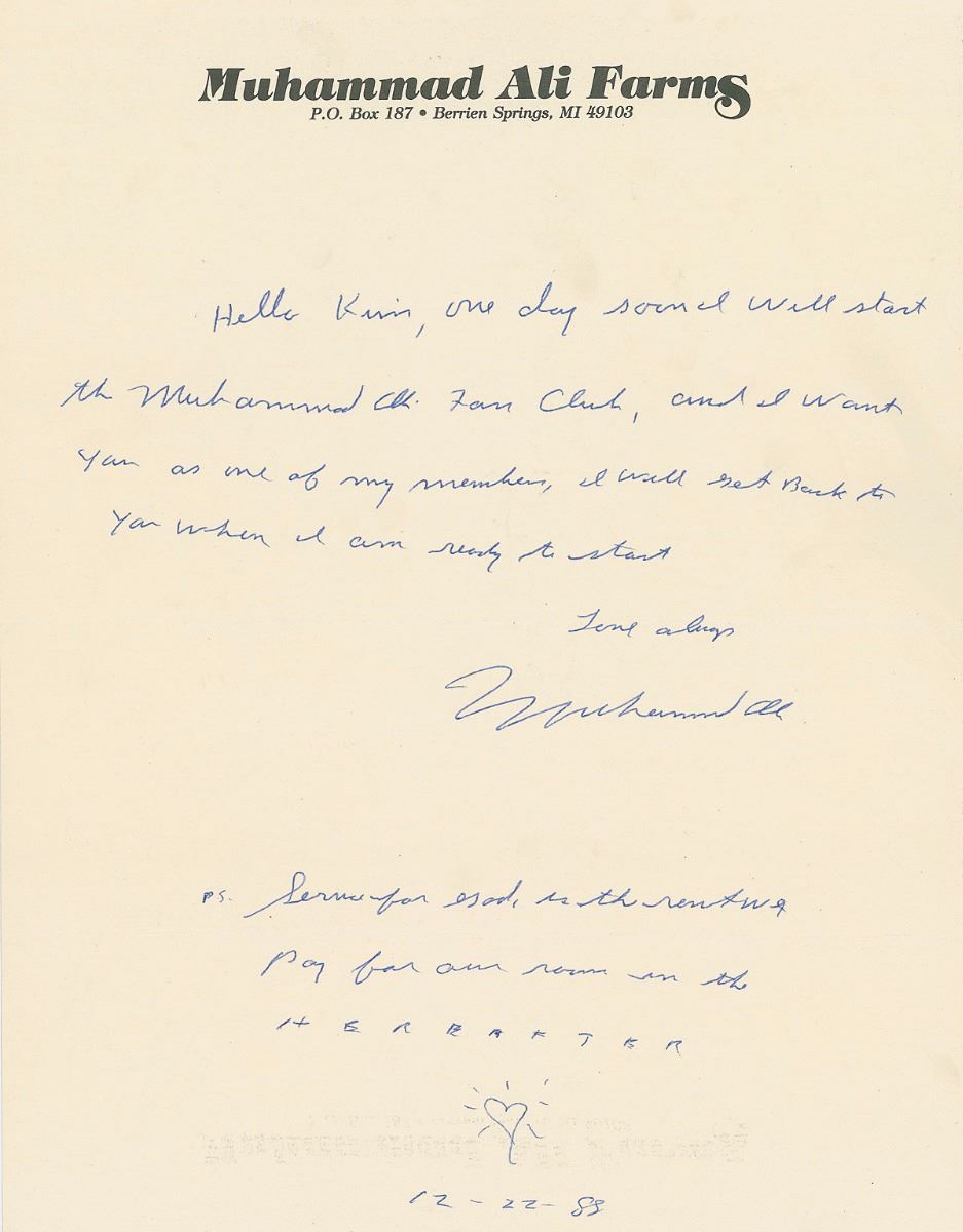 Uncommon ALS, one page, 8.5 x 11, Muhammad Ali Farms letterhead, December 22, 1988. Letter to Kim, in full: “One day soon I will start the Muhammad Ali Fan Club, and I want you as one of my members. I will get back to you when I am ready to start.” Ali adds a brief postscript, “Service for God is the rent we pay for our room in the Hereafter,” and a heart below. In fine condition.