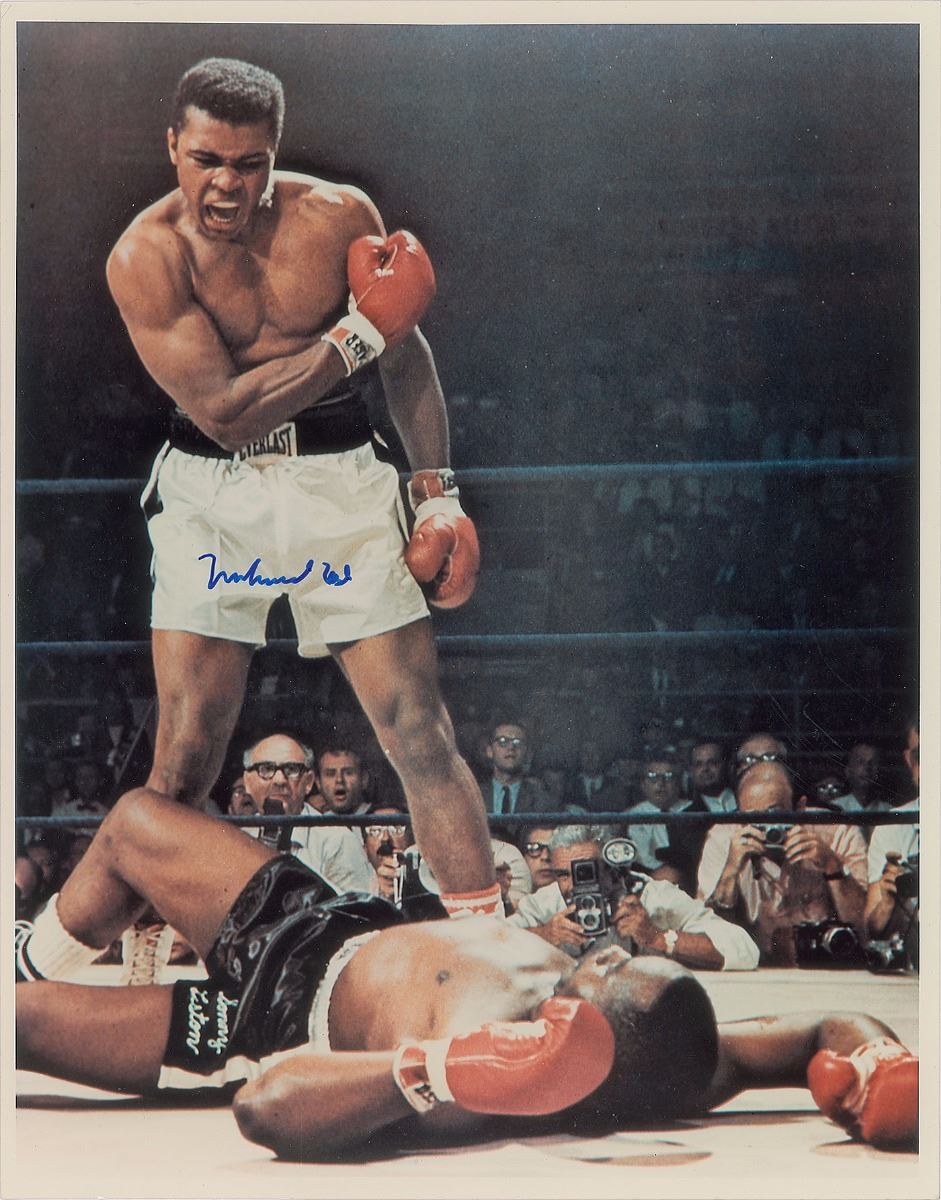 Ideal color glossy 11 x 14 photo of the chiseled Ali towering over a felled Sonny Liston, signed on his trunks in blue felt tip. In fine condition.