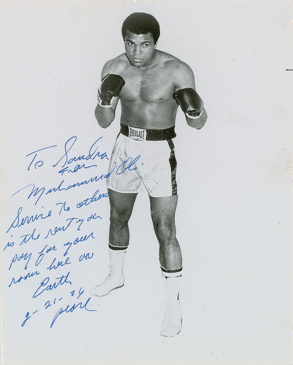 Appealing glossy 8 x 10 full-length photo of Ali in a pugilistic stance, signed and inscribed in blue ink, “To Sandra, from, Muhammad Ali, Service to others is the rent you pay for your room here on Earth, 2-21-76, peace.” In fine condition, with scattered light creases and a small tear to right edge. An earlier signed photo of the iconic fighter than typically seen, signed during his reign as world champion.