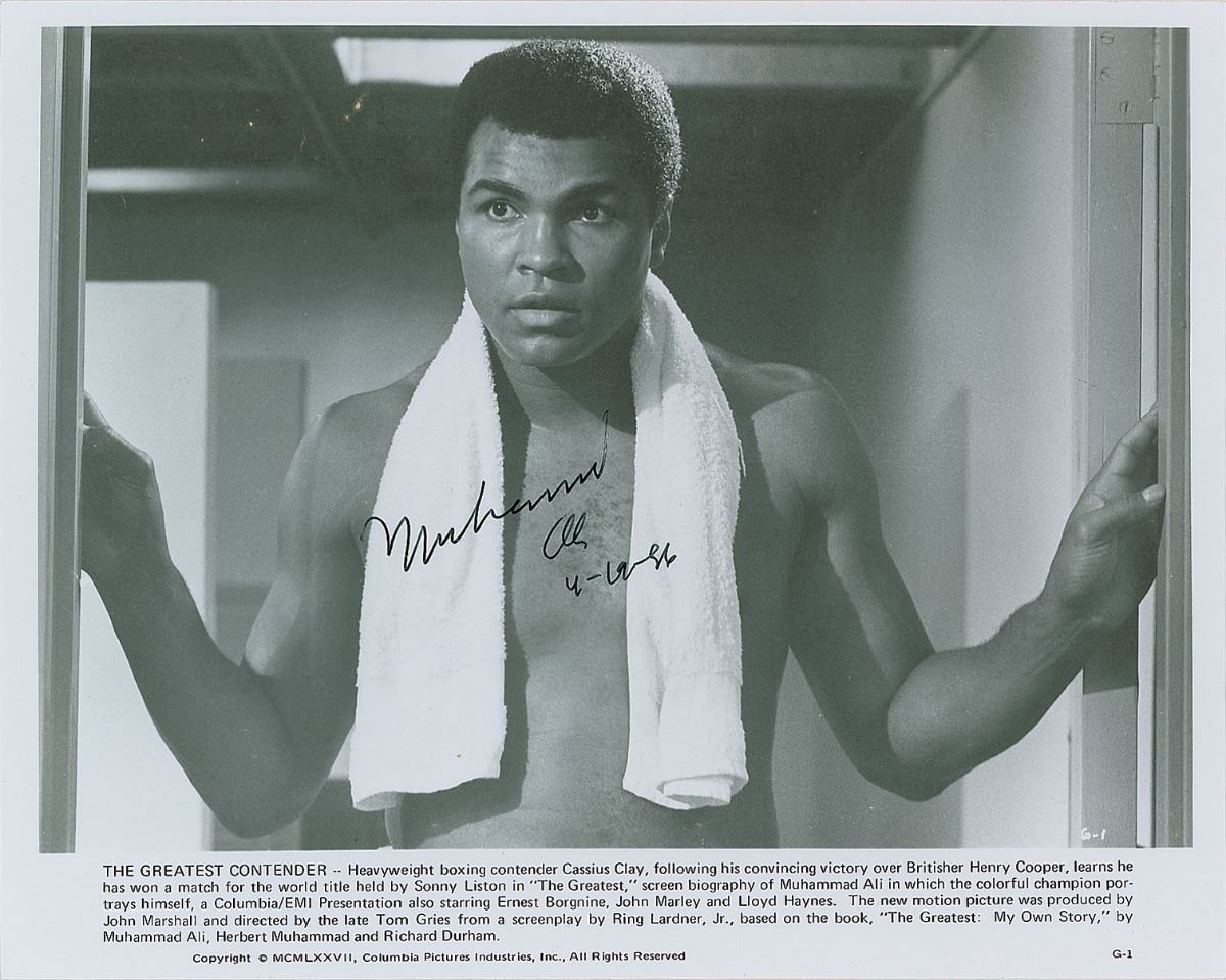 Glossy 10 x 8 Columbia/EMI publicity photo of Ali in the 1977 film The Greatest, signed in black ink, “Muhammad Ali, 4–19–86.” In fine condition.