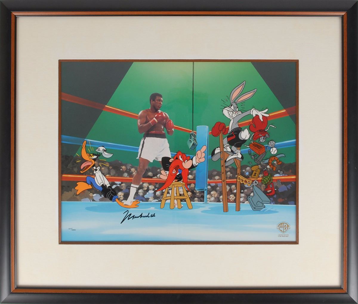 Limited edition Warner Bros. animation cel entitled “Empty that Glove!,” 17.25 x 13, numbered 107/650, depicting Muhammad Ali in the ring with Daffy Duck, Yosemite Sam, and a stilt-walking Bugs Bunny, who is emptying numerous heavy objects and weapons from his boxing glove, signed below Ali in black felt tip. The cel is placed on a matching production background. Cloth-matted and framed to an overall size of 26.25 x 22.25. In very fine condition. Accompanied by a certificate of authenticity from Warner Bros. Oversized.