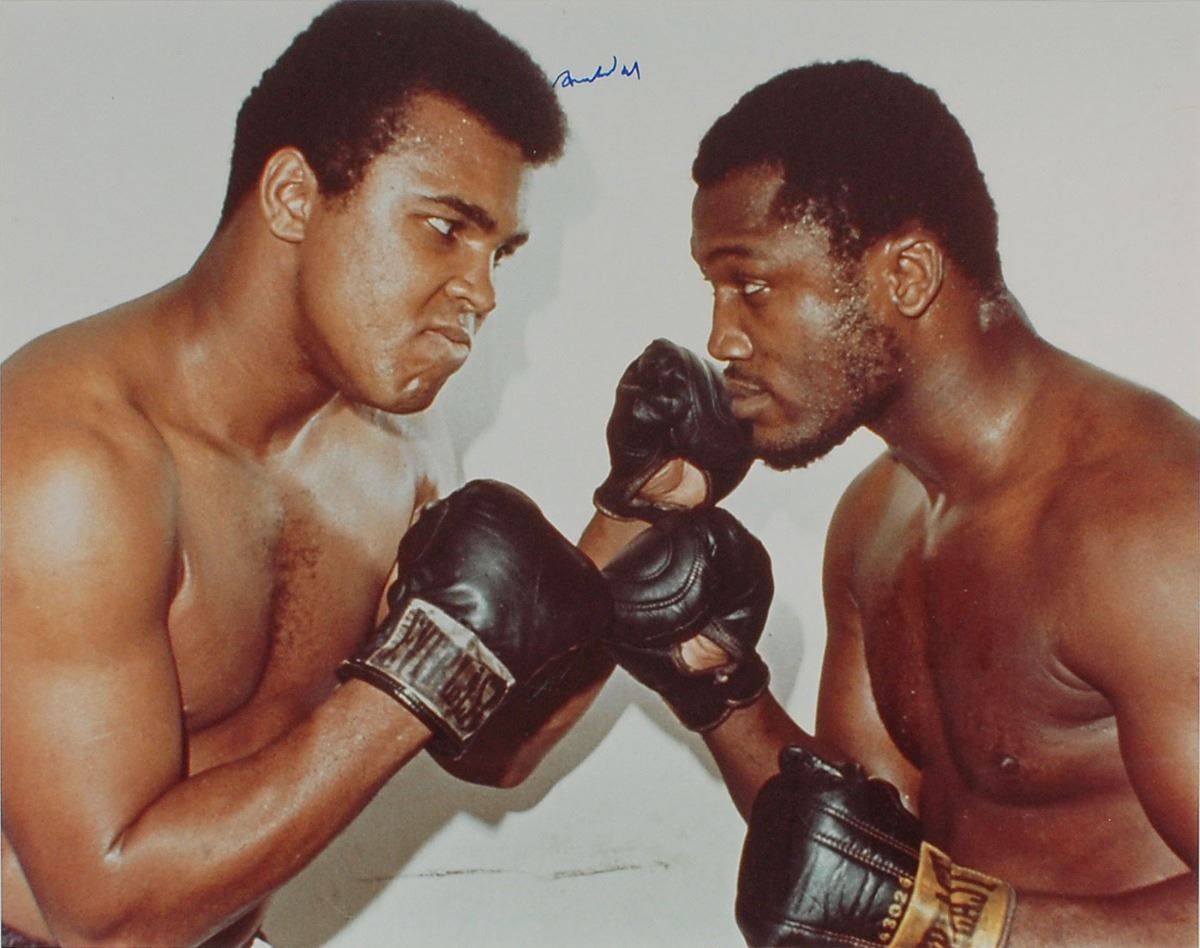 Color satin-finish 20 x 16 photo of Ali squaring off against Joe Frazier, signed in blue felt tip by Ali. Rolled and in fine condition, with scattered light overall creasing. Originally obtained by in-person specialist Mike Wehrmann.