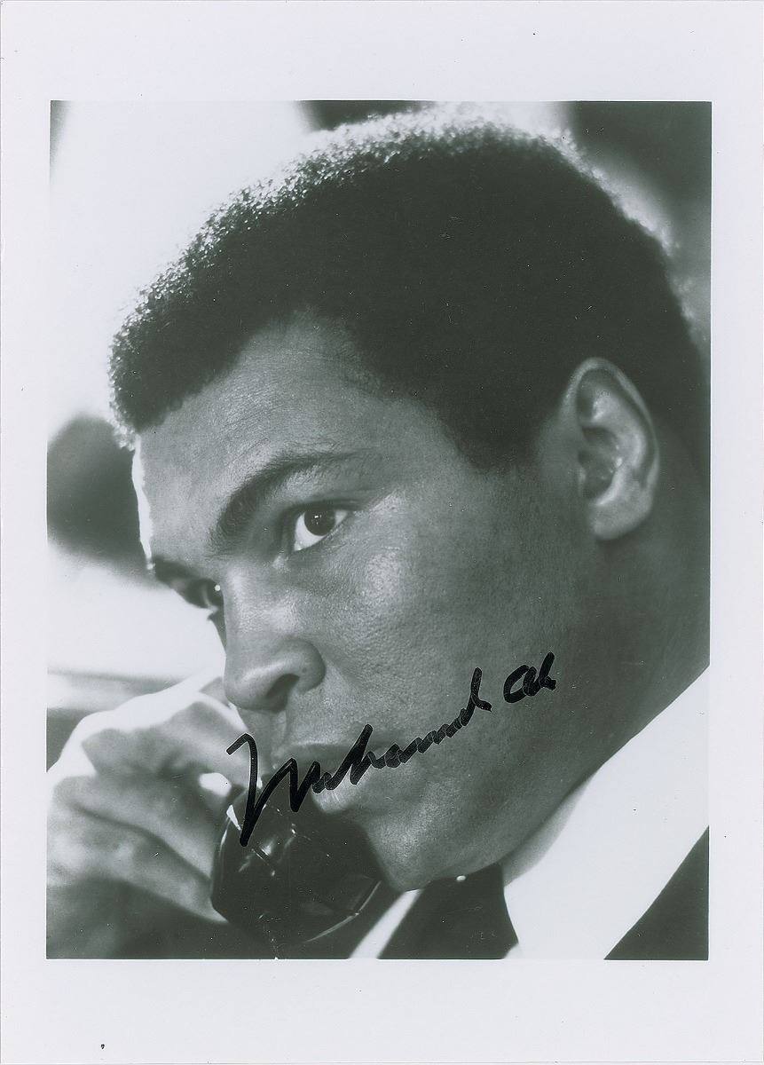 Two items: a glossy 5 x 7 photo of Ali talking on the phone, signed in black felt tip; and a small “God Is One” pamphlet, signed at the bottom in black ballpoint. In fine condition.