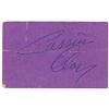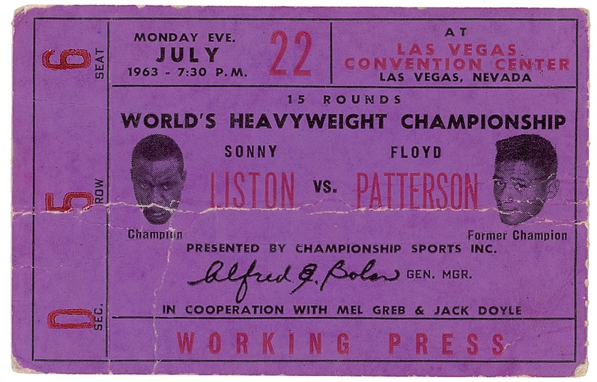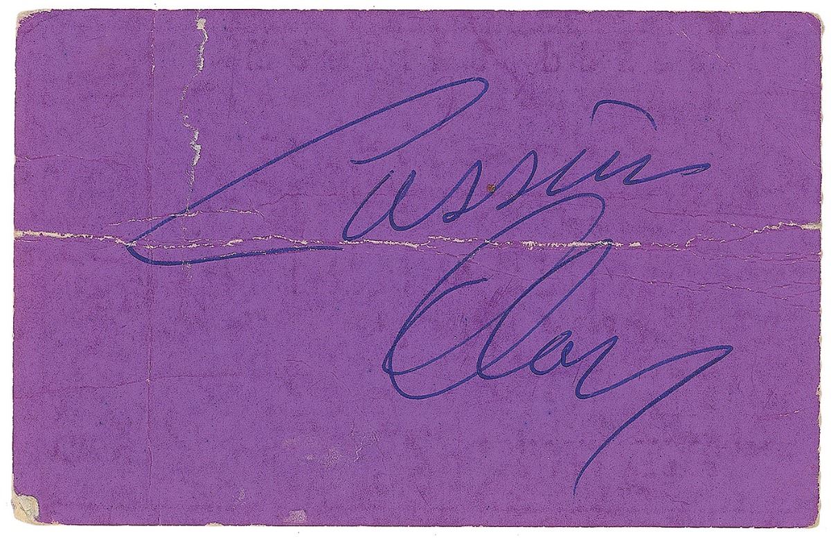 Rare purple ticket stub for the heavyweight championship fight between Sonny Liston and Floyd Patterson on July 22, 1963, 3.75 x 2.5, signed on the reverse in blue ballpoint, “Cassius Clay.” In very good condition, with heavy intersecting folds and a tear extending from the top edge through the first letter of the signature. Accompanied by a full letter of authenticity from PSA/DNA.