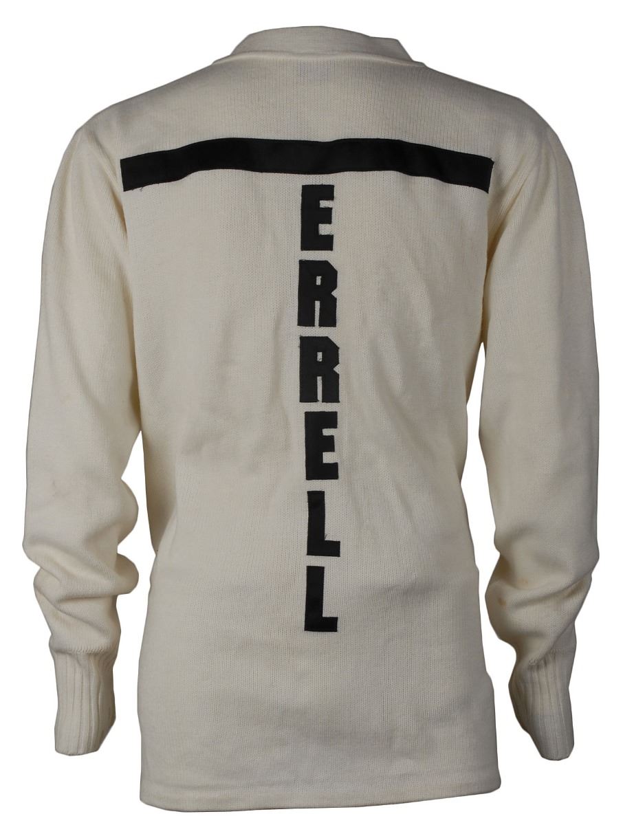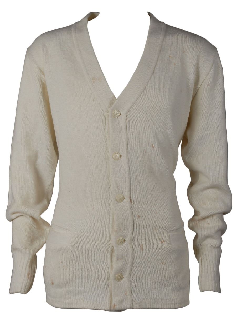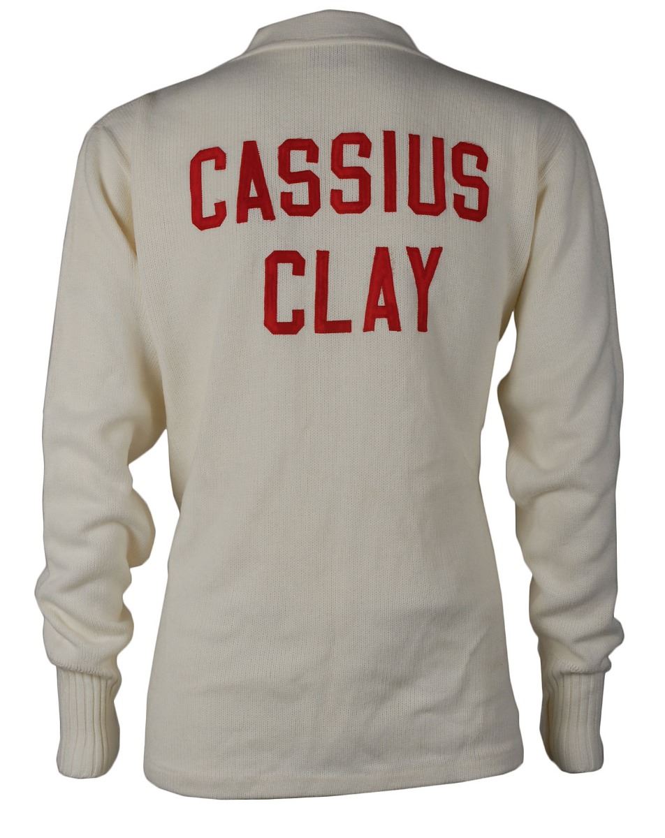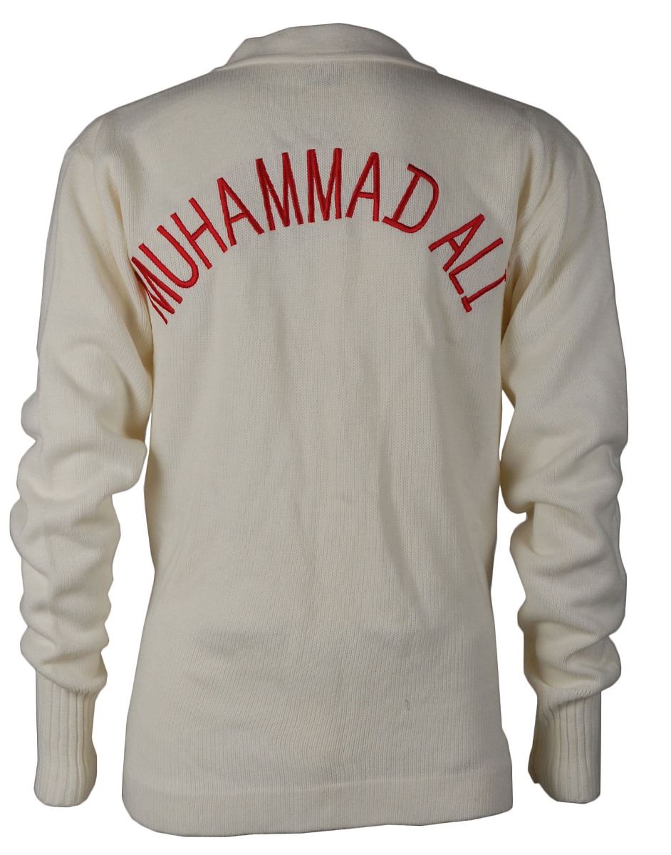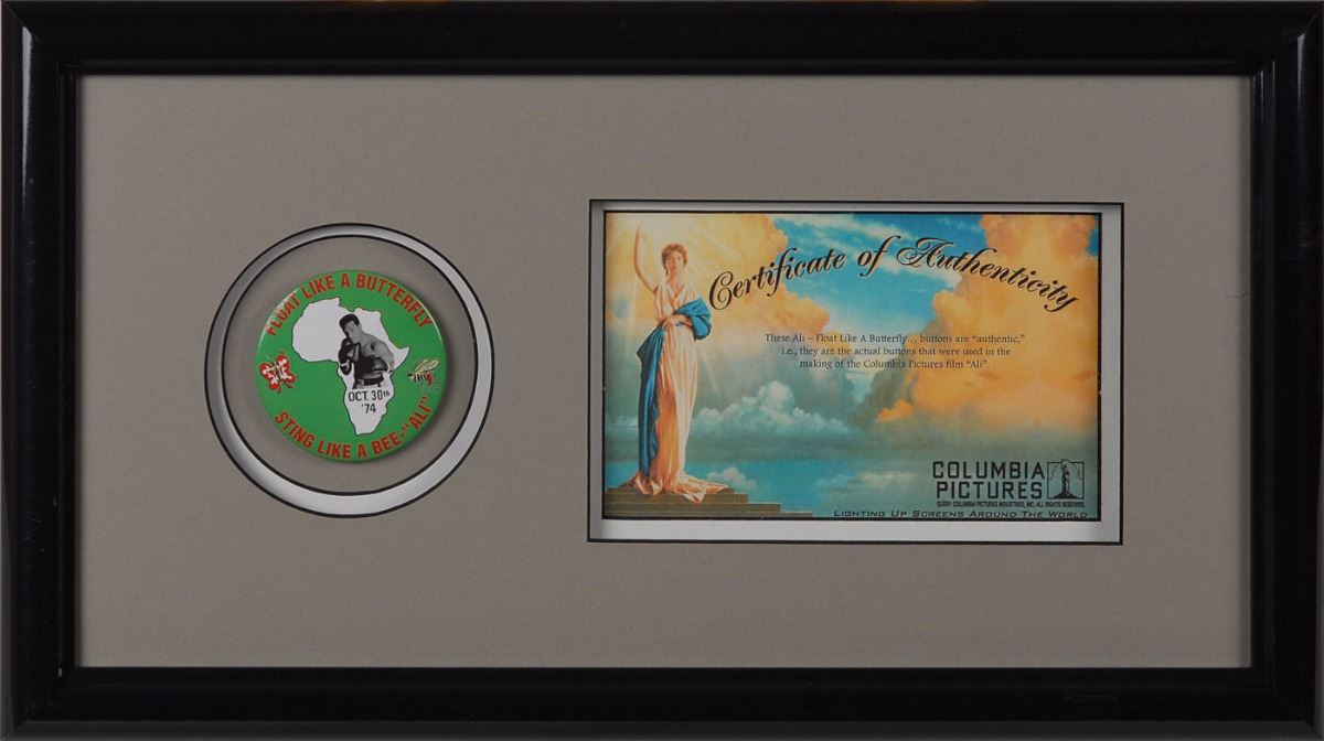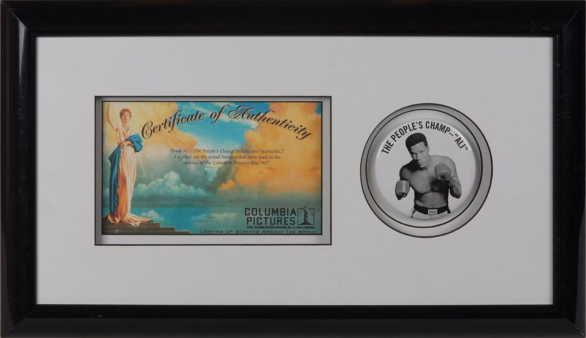 Collection of props from the 2001 film Ali, directed by Michael Mann and starring Will Smith, including: a screen-worn white sweater worn by Jamie Foxx as Ali’s assistant trainer and cornerman Drew Bundini Brown, embroidered in red on the reverse, “Muhammad Ali,” and on the left breast, “Bundini,” retaining its wardrobe tags; a screen-worn white sweater worn by Paul Rodriguez as Ali’s personal physician and cornerman Dr. Ferdie Pacheco, with red patches on the reverse, “Cassius Clay,” retaining its wardrobe tags; a screen-worn white sweater worn by one of Joe Frazier’s cornermen, with yellow patches on the reverse, “Smokin Joe”; and a screen-worn white sweater worn by one of Ernie Terrell’s cornermen, with various ‘blood’ stains from the fight. Also includes two different ‘fight day’ prop buttons used in the making of the film, handsomely matted and framed with their Columbia Pictures certificates of authenticity. In overall fine condition. Accompanied by an official Ali movie book and certificates of authenticity from Sportsrobe, Inc., for the Ali, Clay, and Terrell sweaters. A unique assemblage of uncommon props from this acclaimed film.